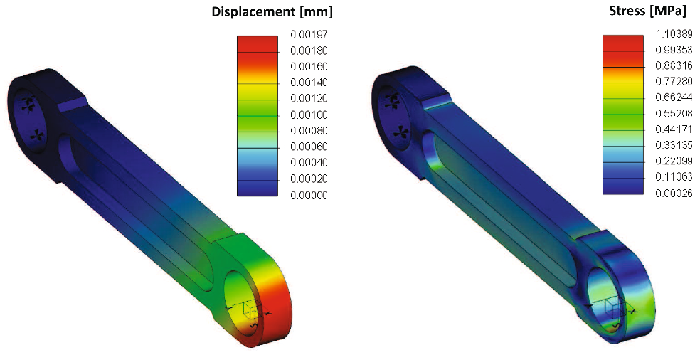 In the FEA environment, the rod is fixed from one extremity (the crank side) and is loaded at the other extremity with the imported loads. The selected boundary conditions aim to diversify the actuator’s side, considered more rigid, from the platform’s side, where the major inertia contributes are to be manifested. PTC Creo Simulate also allows to analyze linear problems with unconstrained models thanks to the “inertia relief” option. To remove the six DoFs, this option automatically defines a constraint set containing three-point constraints in the model. Also, the solver applies body loads that balance the external applied loads. Since the three-point constraints affect the displacement solution, this method seems not to be effective for students that approach the package for the first time. As for the meshing operations, the p-element method simplifies the element generation and does not require high expertise for completing the model. In fact, instead of constantly refining the meshes, the user can simply increase the order of the interpolating polynomials. For a detailed discussion about the p-element meshing method, the interested reader is referred to [52].