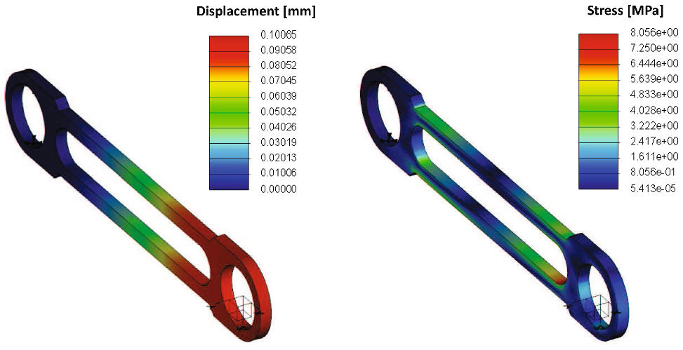 Once the dynamic simulation is completed, the worst load case scenario, namely the load-set containing the maximum value for each of the loads acting on the rod during the motion, is extracted during the post-processing and subsequently imported into the FEA environment. From a functional standpoint, this load-set may result too conservative as it comprises loads registered at different simulation steps. However, in the actual context, it copes well with the need to evaluate the rod’s safety factor, \(S_f\), defined as the ratio between the material’s elastic limit and the maximum occurred Von Mises stress in FEA. Concerning the material properties, the Young’s modulus and the elastic limit are set respectively equal to 73000 MPa and 400 MPa.