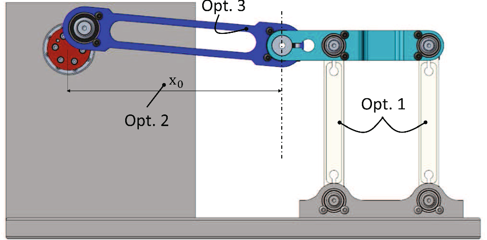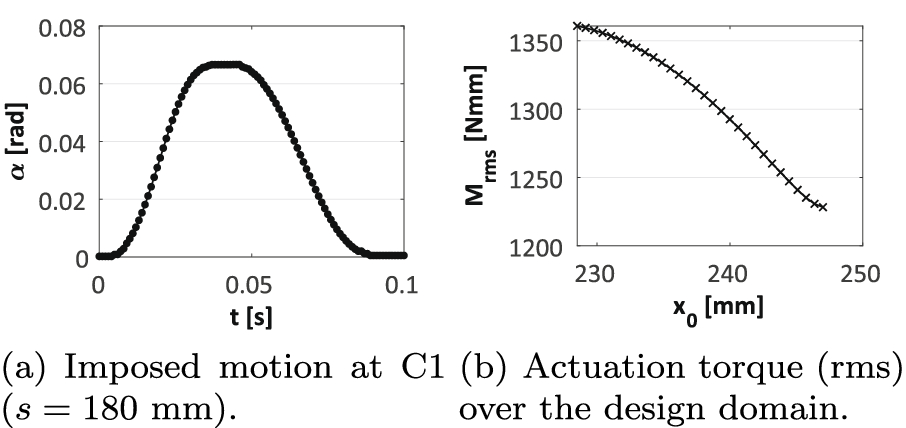 Then, by fixing the APD’s dimensions, an optimization is performed to find the most convenient actuator’s location in the frame, that is the one that minimizes the actuation torque for the required motion. Similarly to the previous step, the problem is completed by leveraging the PTC Creo Behavioural optimizer, and can be formalized as follows:
