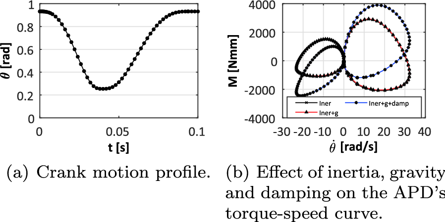 The selection is bound by the limitations imposed by the motor’s working range, and the choice of a specific motion law is the first parameter to be defined when sizing the motor, because it allows to extrapolate the load characteristics. To be consistent with the previous steps, the same cycloidal position law is considered in Step \(\#5\). A new set of three dynamic simulations has been carried out in PTC Creo Mechanism with an input rotational law at R1 (shown Fig. 14a) so as to obtain the APD’s torque-speed curve in the following conditions: