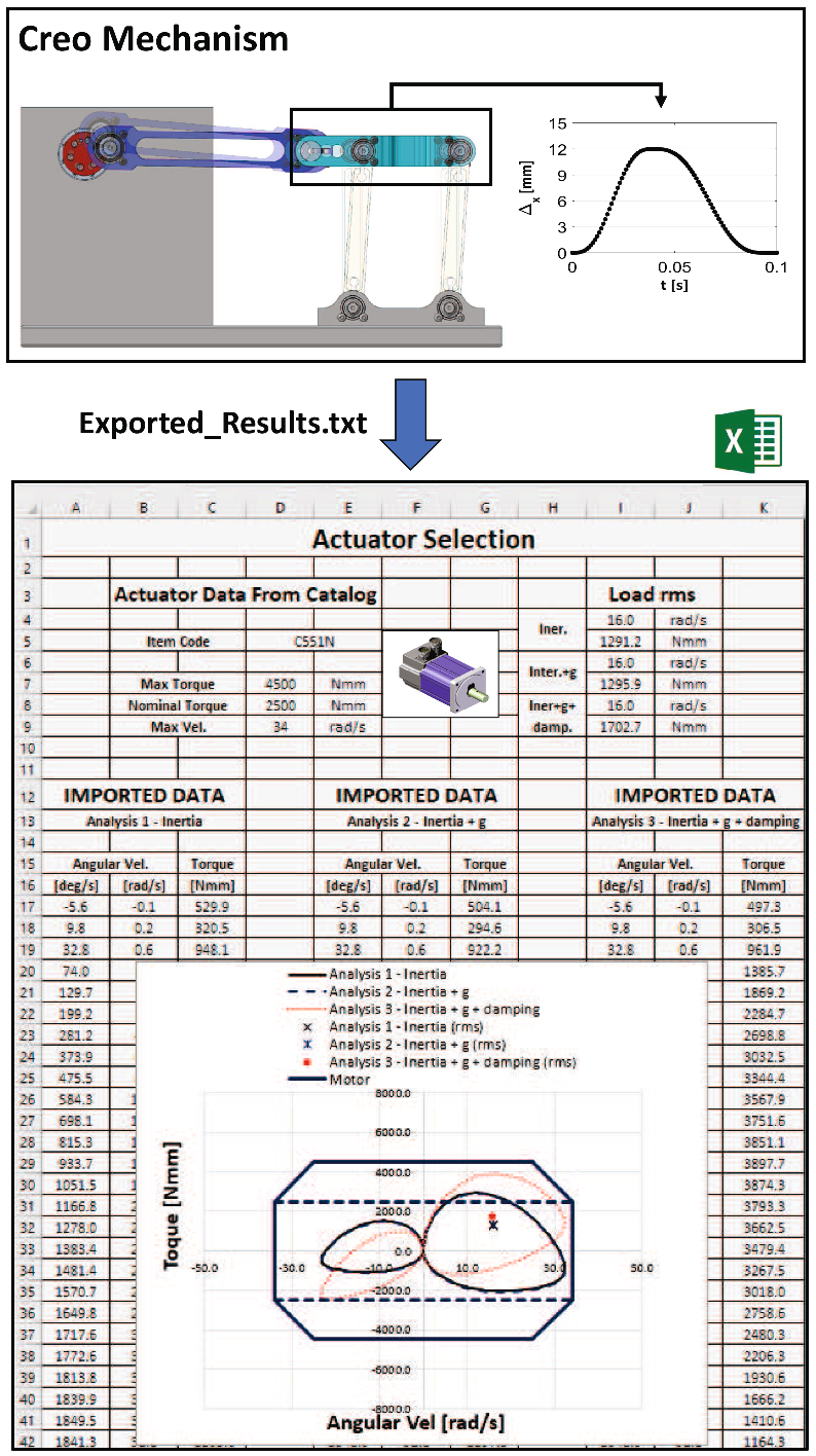 The numerical results, namely \(\dot{\theta }\) and M, are processed via the MBD measure tool (see Fig. 14b) and then exported from PTC Creo and imported in Excel for direct comparison with the motors’ curve obtained from the manufacturer’s catalogs, as shown in Fig. 15. The curves are overlapped as in Fig. 15, and the motor’s limit are checked. The proper actuator selection is based on the following principles: