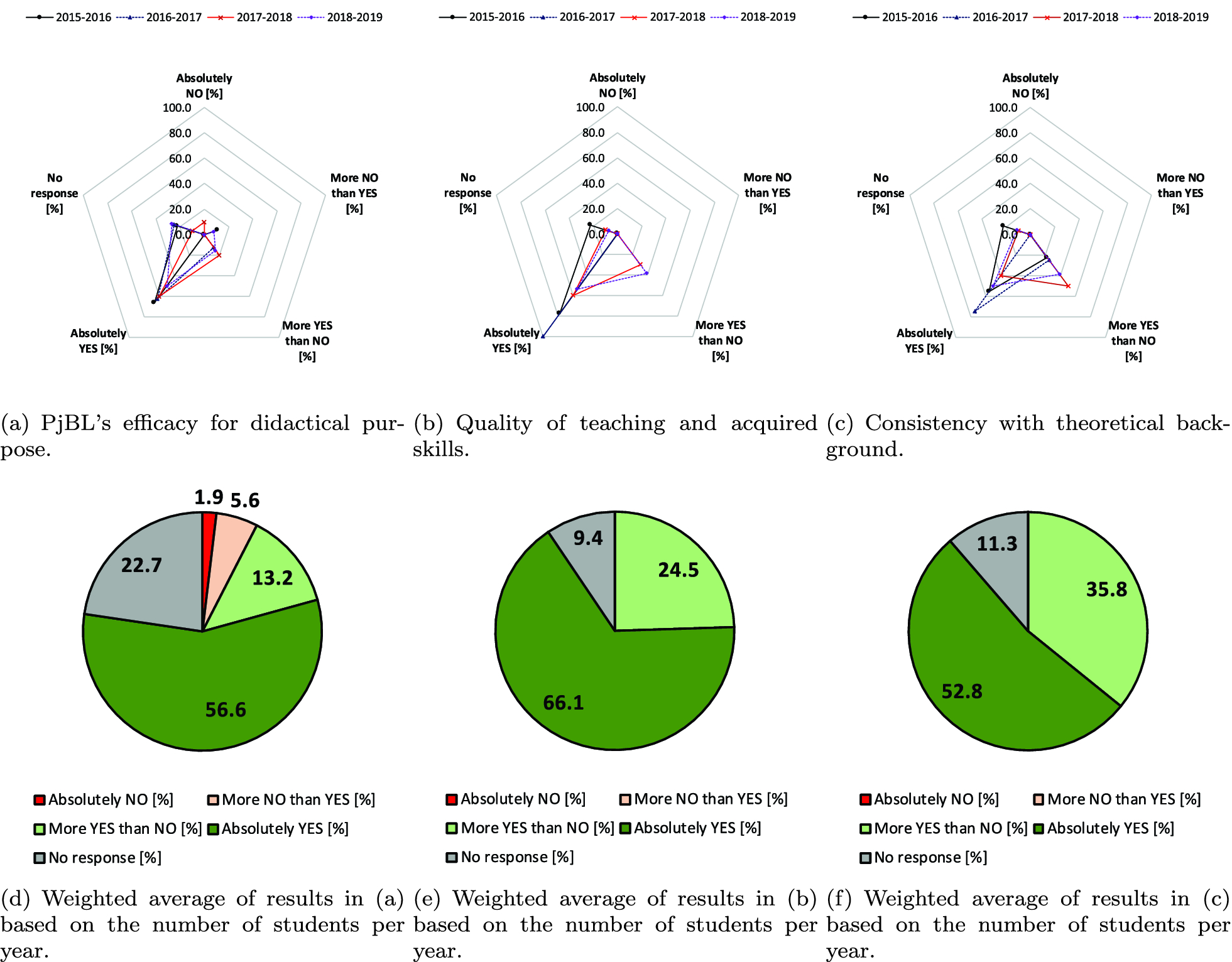 Students’ opinions about the PjBL activity in the last four academic years. Detailed statistics are reported in a–c, whereas weighted average results are summarized in d–f