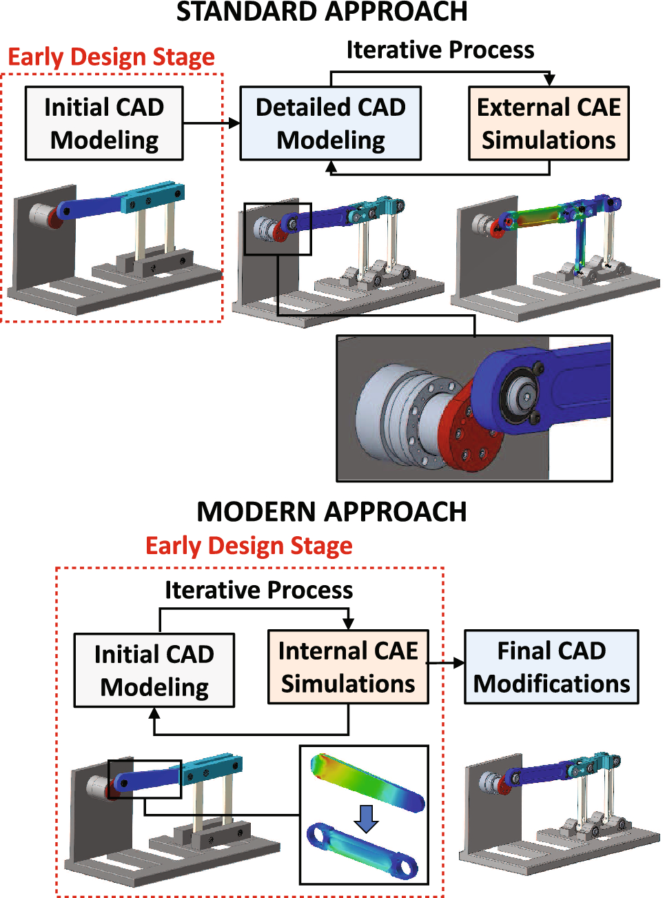 From a fast comparison, it is evident that the former approach is mostly exploited for research purpose, as the frameworks can be finely tailored to meet the design requirements/intents, whereas the latter is certainly suitable for industry, where easy-to-use and fast tools are still preferable. From a practical standpoint, these integrated CAD/CAE platforms allow to simulate the behavior of parts starting from the early-design stage, as schematized in Fig. 1, reducing the overall time-to-market and product cost.