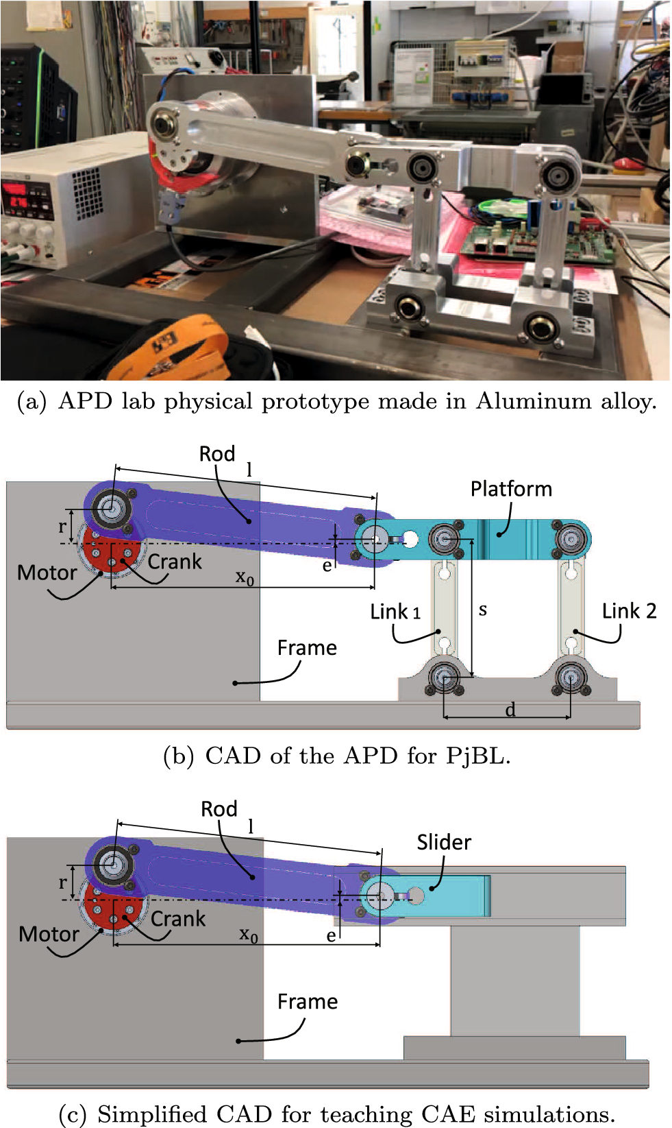 As previously introduced, the PjBL activity starts with a seminar, in which an engineer from industry presents a new design problem and provides the main specs and requirements of the automatic machine. To correctly modulate the students’ workload over the course, which overall provides 6 credits (i.e. ECTS-European Credit Transfer System), equally divided between theoretical and practical parts, a single functional subgroup of the automatic machine is considered for the PjBL. The proposed subgroup is identified by a single Degree of Freedom (DoF) position-controlled linkage mechanism. Figure 2a, b report the last year assignment, namely a planar Automatic Pushing Device (APD), composed of a slider-crank linkage and a parallel four-bar linkage. The initial dimensions of each component (Crank, Rod, Link 1,2) are given during the seminar and are summarized in Table 1.