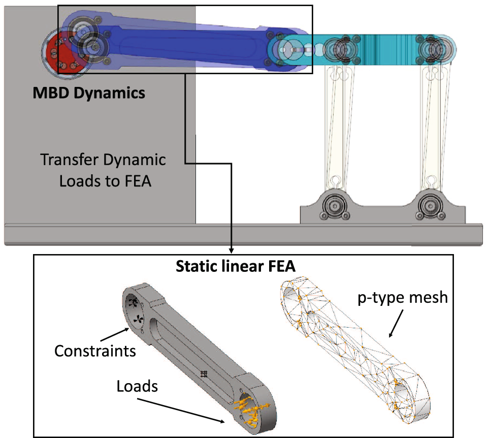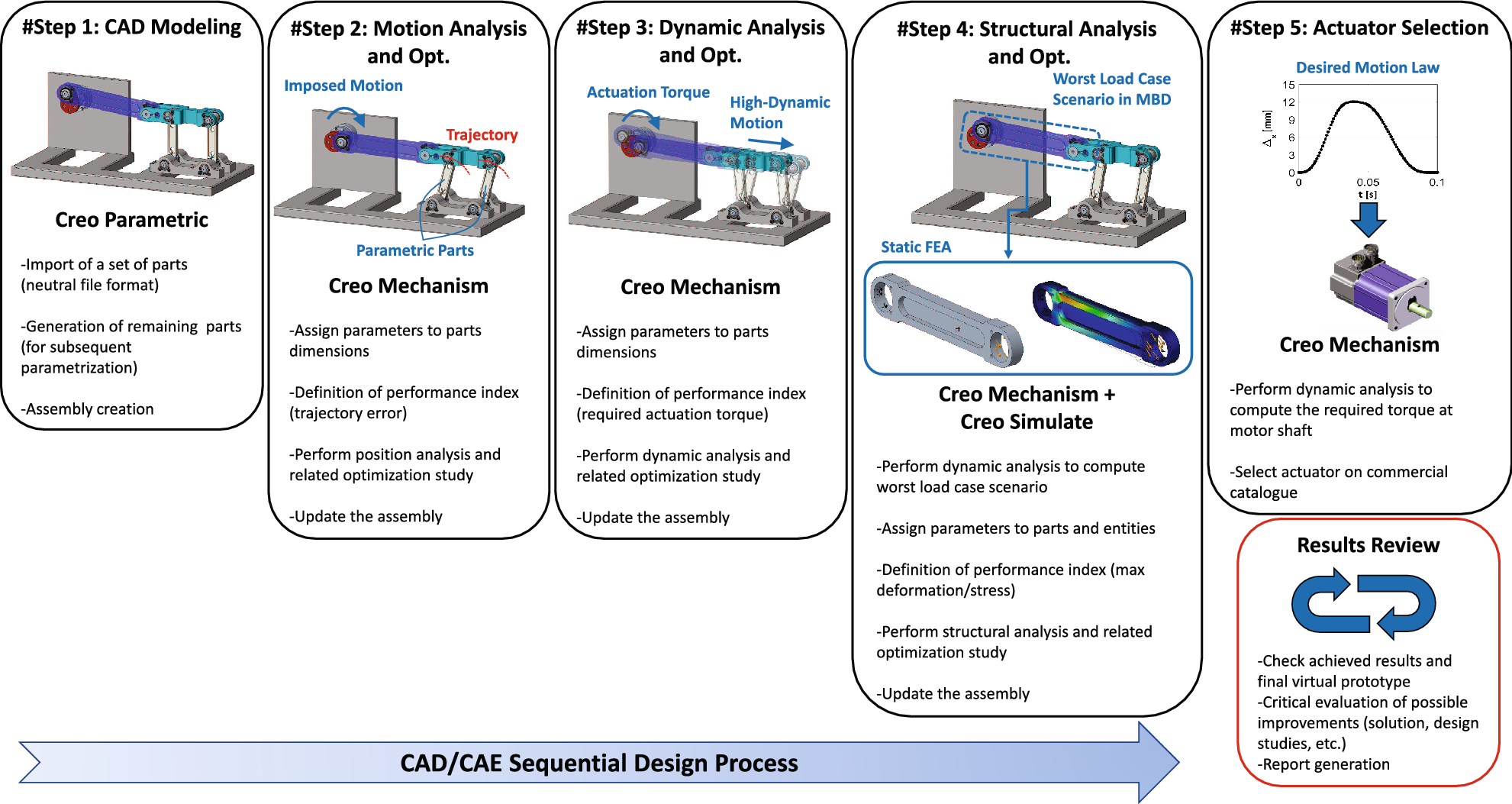 Step\(\#4\): Structural Analysis and Optimization - The worst load case scenario is evaluated in the MBD environment by performing a dynamic simulation on the APD configuration resulting from the previous step. The loads are then automatically transferred from the MBD environment to the FEA environment (i.e. Creo Simulate) to perform static structural verification on components. A structural optimization study is then carried out on a single component (e.g. the rod) to minimize its overall mass.
