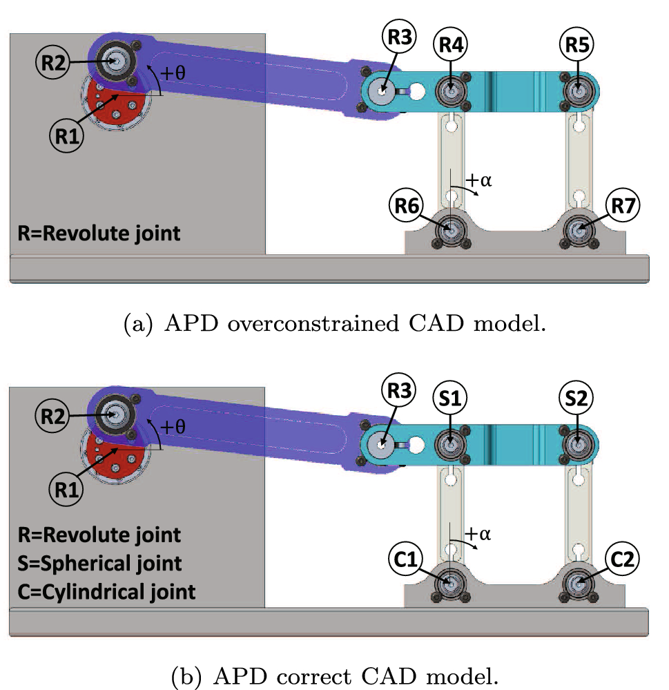 The joints selection and application is an aspect of primary importance in view of the CAE analysis. Redundancies are excess constraints that do not apply any restrictions to the system motion, though they may lead to inaccurate results when performing dynamic analysis. Therefore, the presence of redundancies in the model is simply checked by running a kinematic analysis. The input motion can be a generic law (e.g. a constant velocity on the crank shaft), and the number of redundant constraints is made available by PTC Creo Mechanisms via the “Measure” tool. An example of overconstrained model is shown in Fig. 4a, which also represents the students’ first version of the APD model. The updated model is shown in Fig.4b.