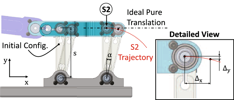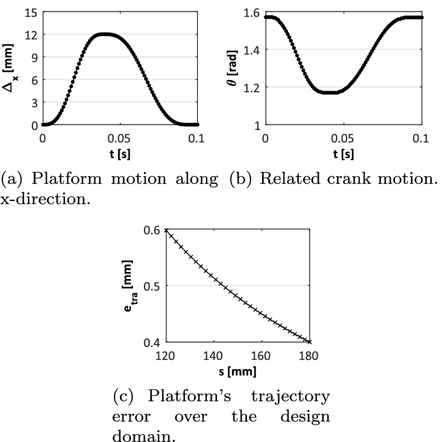 In the following, a kinematic optimization study is conducted on the APD within the Step \(\#2\), the input being a desired motion profile for the Platform (the APD’s end-effector). With reference to Fig. 5, the dimension s, namely the length of Link 1,2, is adopted as parameter, whereas the Platform’s trajectory error with respect to an ideal pure translational path, \(\varDelta _y\), is the cost function to be minimized. For an assigned motion profile, the problem can be expressed as follows: