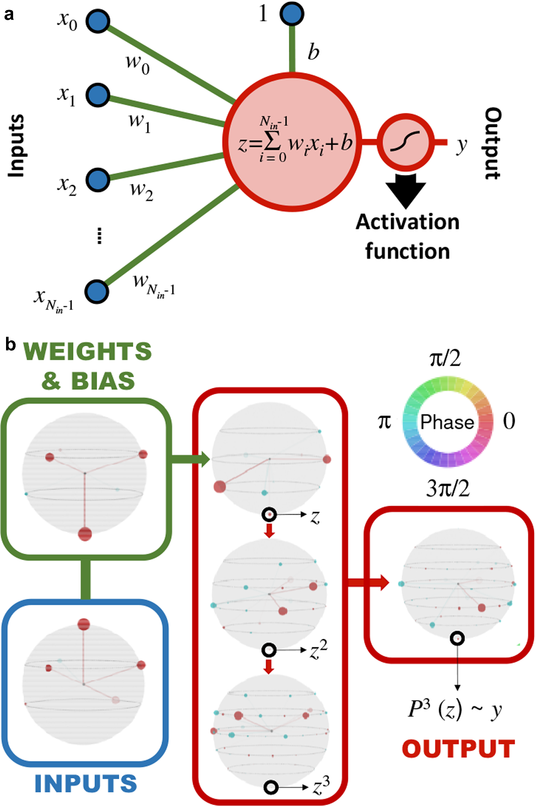 Graphical representation of a one-layer perceptron and relative qubit-based version. A one-layer perceptron architecture (a) is composed by an input layer of \(N_{in}\) neurons connected to the single output neuron. It is characterized by an input vector \(\vec x\), a weight’s vector \(\vec w\) and a bias b. In the classical version, the activation function takes as argument the value \(z=\vec w \cdot \vec x + b\) and it returns the perceptron output y. The quantum version (b) follows the same architecture but the calculus consists of a sequence of transformations of a n-qubits quantum state initialized with the coefficients of the inputs vector \(\vec x\) as probability amplitudes. The quantum states at each step are represented by a qsphere (graphical representation of a multi-qubit quantum state). In a qsphere, each point is a different coefficient of the superposition quantum state. Generally, the coefficients are complex and in a qsphere the modules of the coefficients are proportional to the radius of the points while the phases depend on the color. In the blue box, it is shown the starting quantum state with the inputs stored as probability amplitudes. Instead, in the green box it is shown the quantum state with the weights and the bias. In the first red box, at each step one qubit is added in order to store the power terms of z up to d (\(d=3\) in the Figure). In the last red box, the output of the perceptron is given by a series of rotations which compose a polynomial \(P^d(z)\) (\(d=3\) in the Figure).