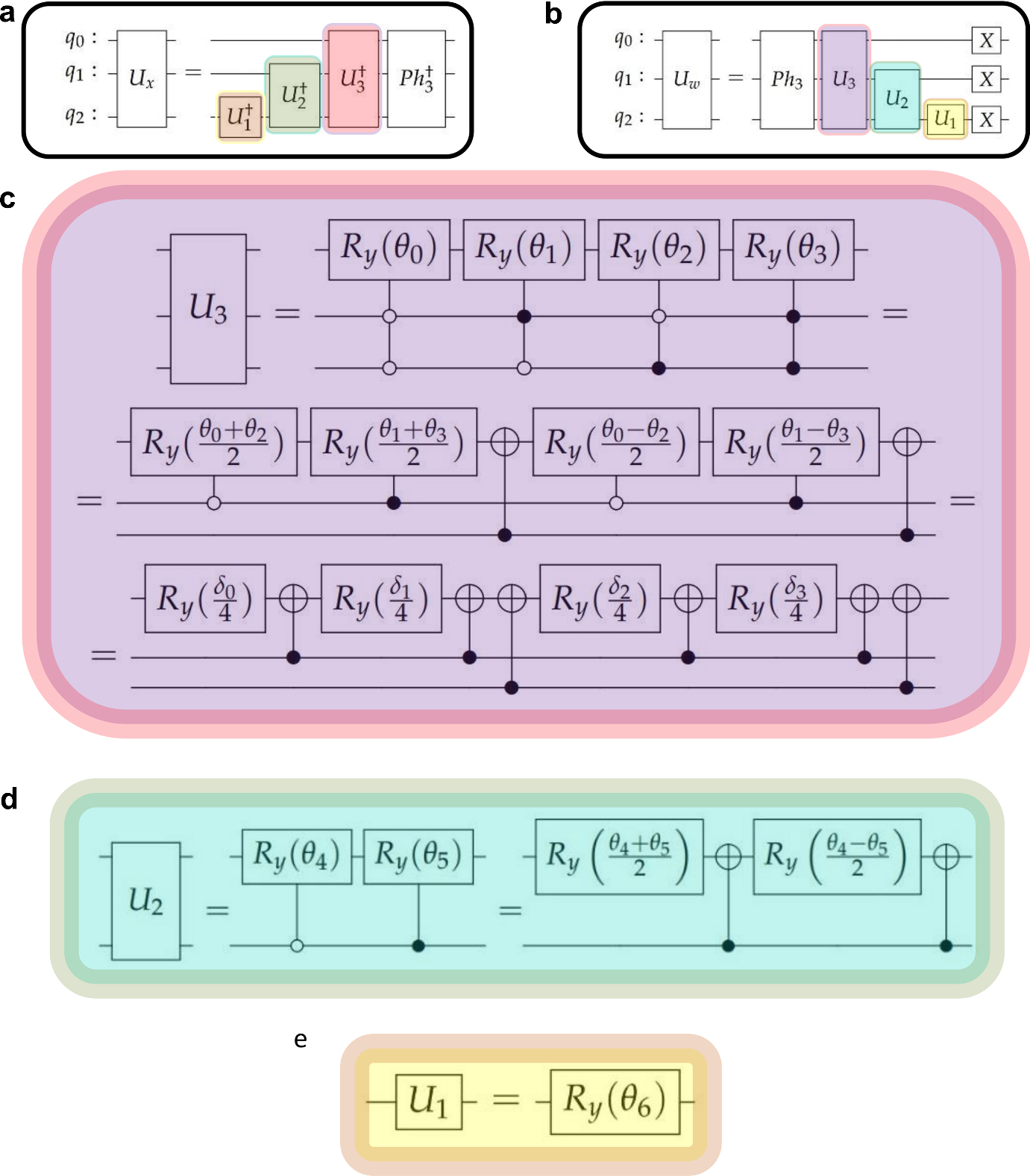 Fundamental gates composition of the transformations \(U_{w,b}\) and \(U_{x}\). The transformations \({\mathcal {U}}\left( \vec v_x\right) \) and \({\mathcal {U}}\left( \vec v_{w,b}\right) \) encode, respectively, the coefficients of the vectors \(v_{x}\) and \(v_{w,b}\) in a superposition quantum state. They are composed of the inverse of the operators \(U_i\) where \(i=1,\dots ,n\) and \(Ph_3\), which introduces the phases of the probability amplitudes. The operators \(U_3\)(c), \(U_2\)(d) and \(U_1\)(e) are shown as composition of multi-controlled rotations \(R_y\) which are equal to a composition of gates \(R_y\) and Controlled-Not [40]. The transformation \(\scriptstyle Ph^{\dag }_3\) (a) introduces the phases of the amplitudes while \(Ph_3\)(b) removes them. The details of the arbitrary quantum state preparation circuit are described in Supplementary Note 1