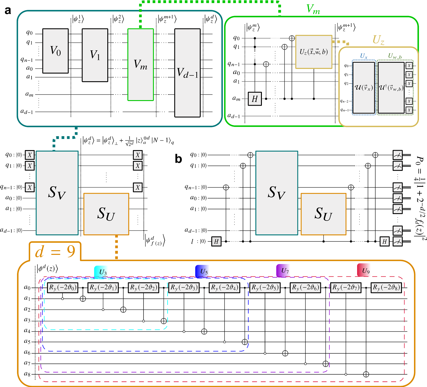 Quantum circuit of a qubit-based one-layer perceptron in two different cases. (a) The quantum circuit which returns the state \(|\psi ^d_{f(z)}\rangle \) encodes the value \(f_d(z)\) as stated by Theorems 1 and 2 . In a more general context, \(f_d(z)\) is the output value of a neuron of a deep neural network hidden layer, as no measurement is required when the information is sent to the next layer. The subroutines \(S_V\) and \(S_U\) are described in the upper boxes, where the general case of \(S_V\) is shown, and in the lower box, respectively. In the latter, it is shown a particular case at \(d=9\). Such value corresponds to the maximum order of \(d=9\) of the polynomial expansion used for approximating the activation functions tanh, sigmoid and sine. (b) A complete quantum circuit of a qubit-based one-layer perceptron is shown. In such case, by performing the measurements of all the qubits and averaging after many repetitions of the circuit, it is possible to estimate the output \(y_q\) of the one-layer perceptron