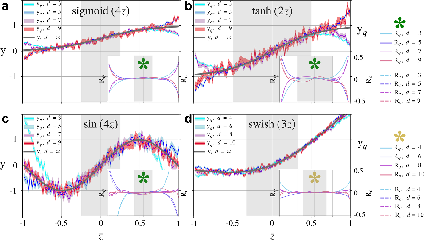 To quantify the difference between \(R_q\) and \(R_c\), let us compute the mean square error (MSE) at different orders d in the gray region of \({\bar{z}}\) in Fig. 4. The value of MSE between \(R_q\) and \(R_c\) is almost always of the order \(10^{-5}\) for \(d=3\) (4 for the swish) and \(10^{-4}\) when d increases. For the hyperbolic tangent, the MSE is of the order \(10^{-3}\) when \(d=7\) and 9.