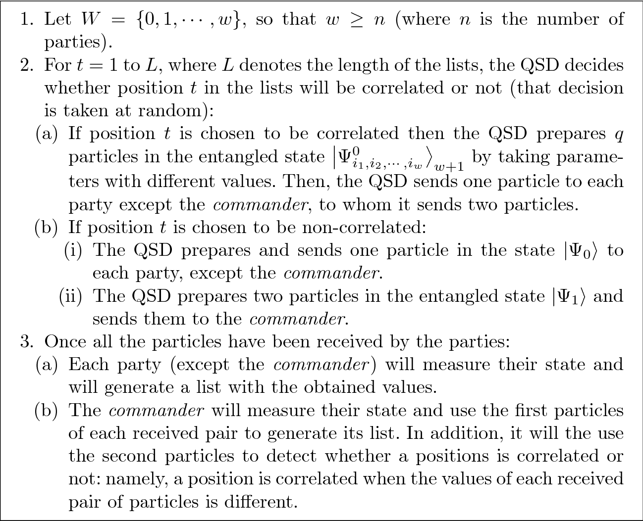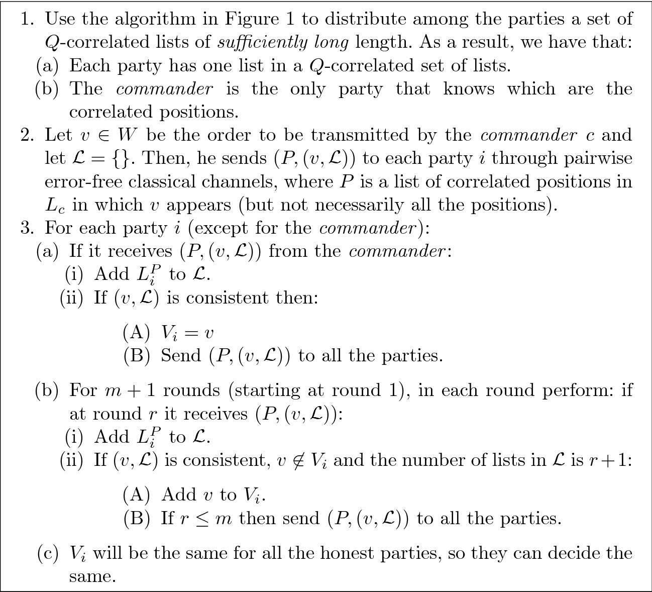 The rest of the paper is structured as follows. In Sect. 2, we define Q-correlated lists, In Sect. 3, we show how the above-mentioned Q-correlated lists can be distributed, so that any forgery of their states can be detected. In Sect. 4, we introduce an algorithm that, by using these lists, solves the BA problem in a classical manner without using any quantum resources. We end, in Sect. 6, with some open issues.