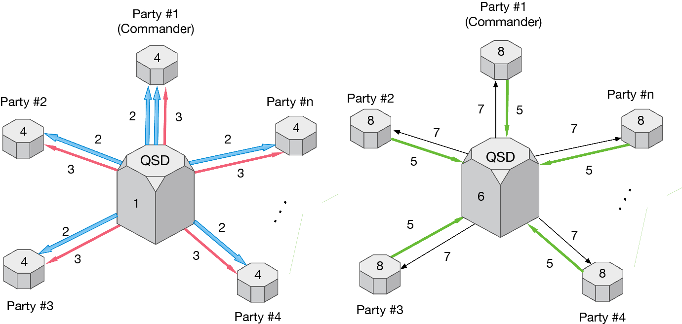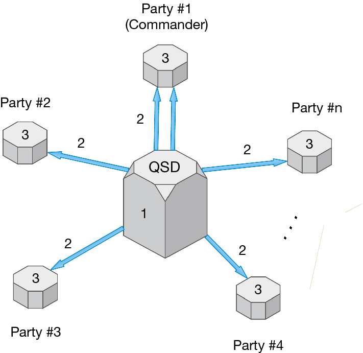 To further clarify how the above-mentioned quantum protocol works, in Fig. 2 we show how it interacts with both the QSD and the parties.