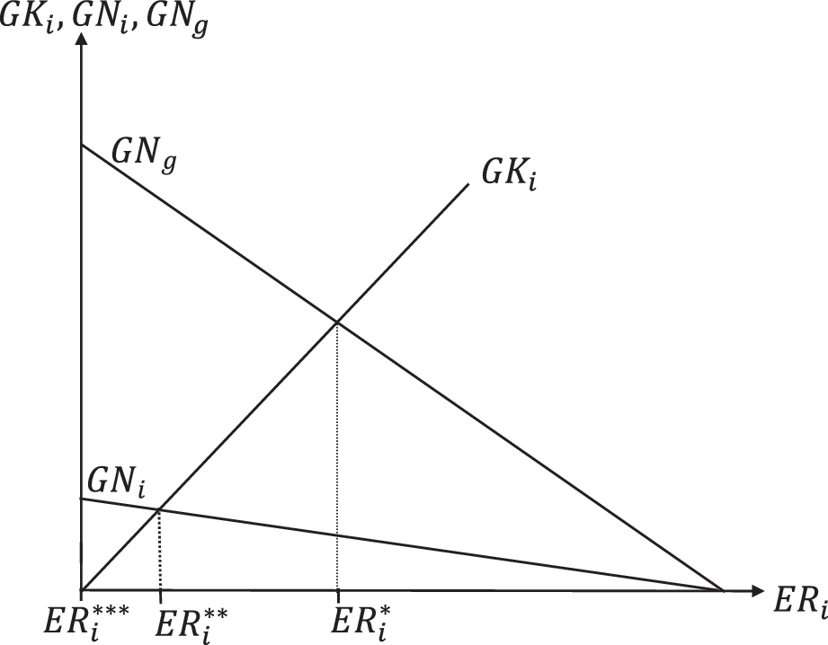 Diese Problematik wird in Abb. 3 veranschaulicht: \(GK_{i}\) bezeichnet die Grenzkosten der Emissionsreduktion (\(ER_{i}\)) des Landes \(i\), \(GN_{i}\) den Grenznutzen dieser Reduktion für das Land \(i\) und \(GN_{g}\) den globalen Grenznutzen der Emissionsreduktion. Global effizient wäre das Reduktionsniveau \(ER_{i}^{*}\), bei dem \(GK_{i}\) und \(GN_{g}\) gleich sind. Falls das Land \(i\) unabhängig vom Rest der Welt seine Emissionen reduziert und die Konsequenzen seiner Politik auf die anderen Länder ignoriert, wird es \(GK_{i}\) und \(GN_{i}\) zum Ausgleich bringen, also nur das (aus globaler Sicht) ineffizient niedrige Reduktionsniveau \(ER_{i}^{**}\) realisieren.