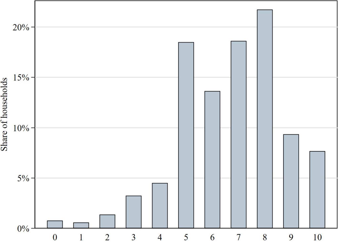 Life satisfaction (LS) – a widely used measure of self-assessed subjective well-being (SWB) (Clark, 2016) – is captured by the question: “On a scale from 0 to 10, how satisfied are you overall with your life?” Each reference person in the household was asked to respond using an 11-point scale, where ‘0’ indicates complete dissatisfaction and ‘10’ indicates complete satisfaction. Similar life satisfaction questions are used in numerous other surveys (e.g., the British Household Panel Survey, the German Socio-Economic Panel, the World Values Survey), and are widely considered valid and reliable indicators of evaluative well-being (see, e.g., Clark, 2018).