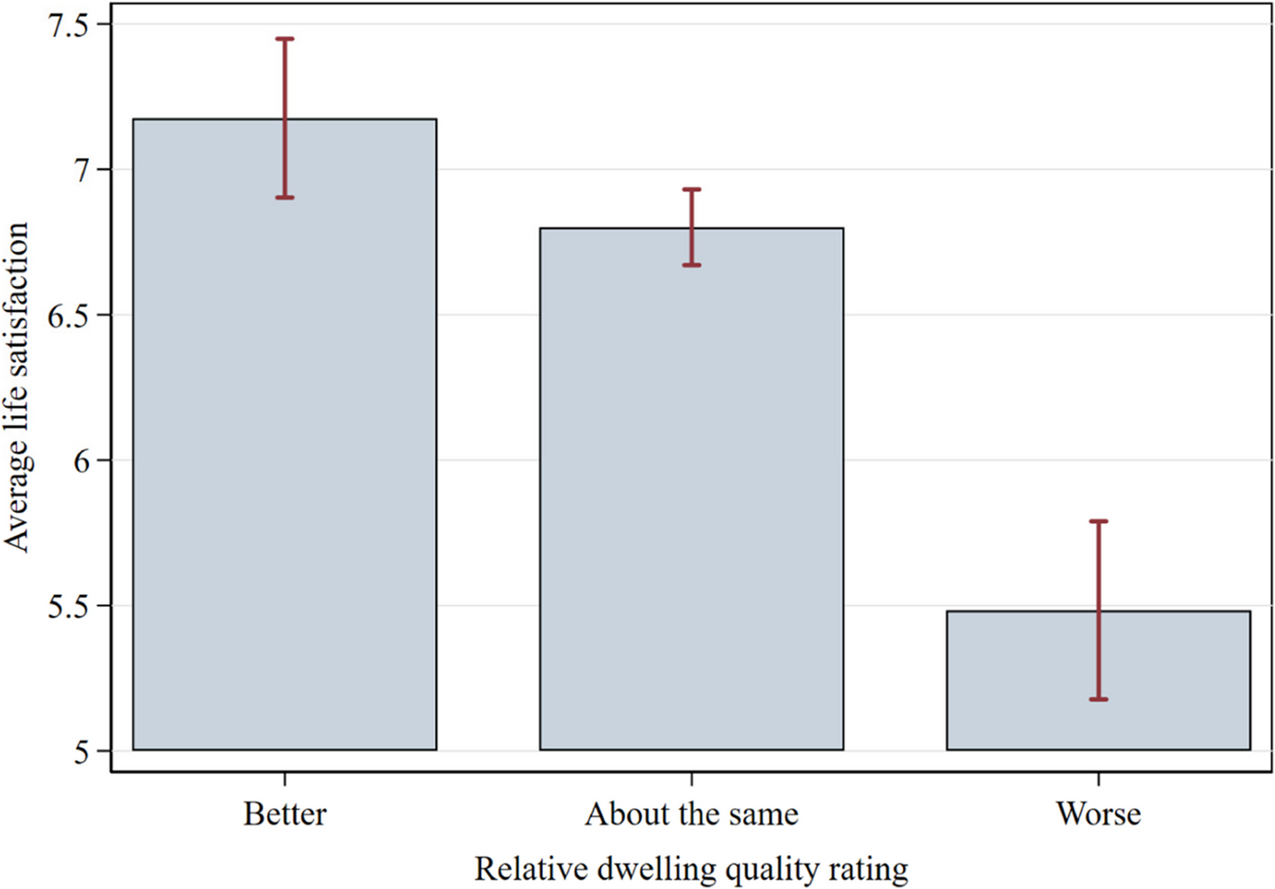 Next, we examine the potential role of relative real asset comparisons by incorporating interviewer ratings of dwelling quality. These ratings serve as a proxy for respondents’ relative standing in their immediate local environment, capturing whether their dwelling is judged by the interviewer to be of ‘better’, ‘worse’, or ‘about the same’ quality as neighbouring dwellings. We include these ratings in the regression model as categorical variables, with ‘about the same’ as the reference category. This enables us to estimate the differential association of relative status – controlling for absolute asset holdings – with life satisfaction: