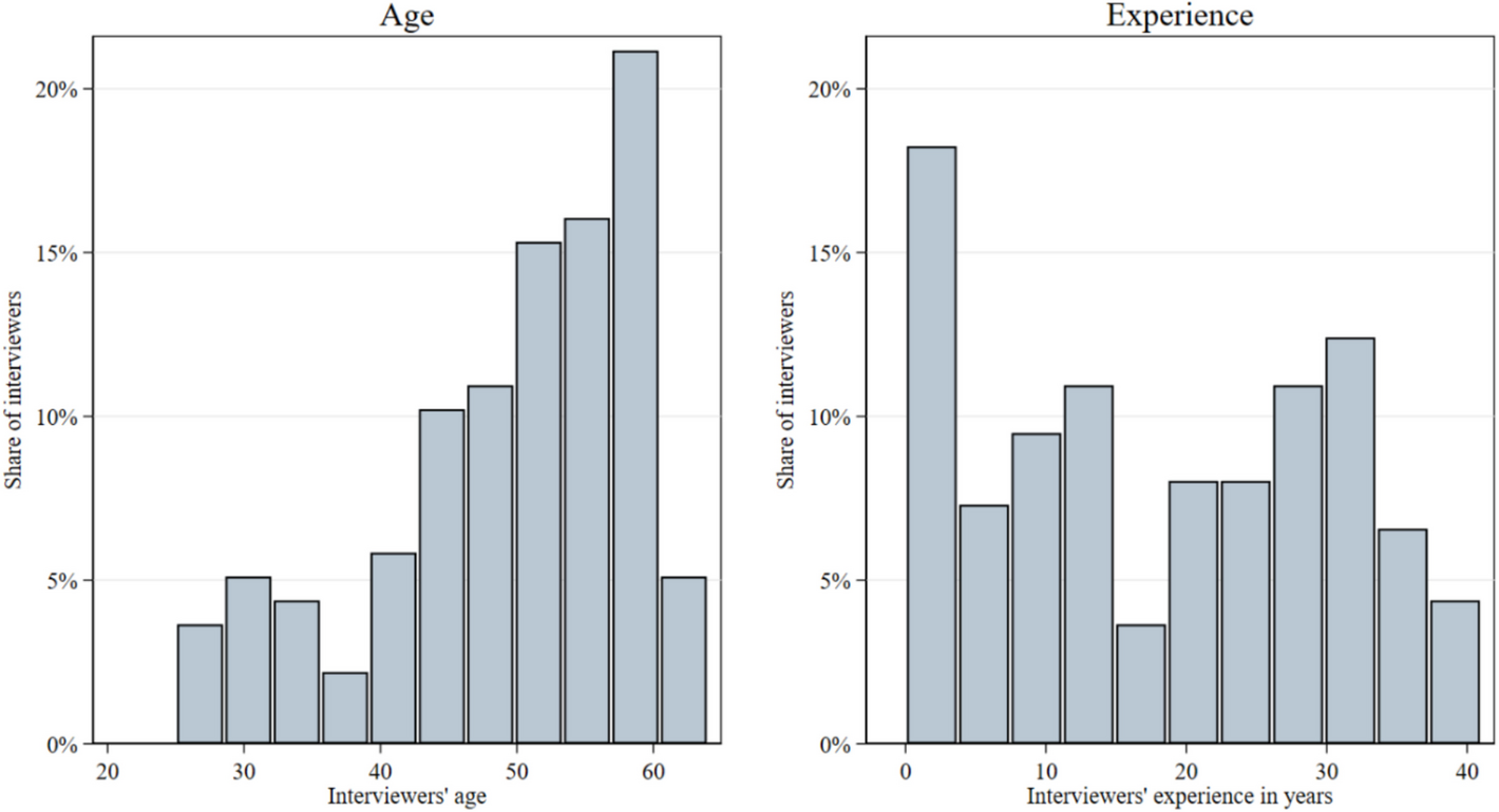 As shown in Table 6 in the Appendix, the average interviewer had 18.39 years of experience, although this figure masks considerable heterogeneity (see Appendix Fig. 5).