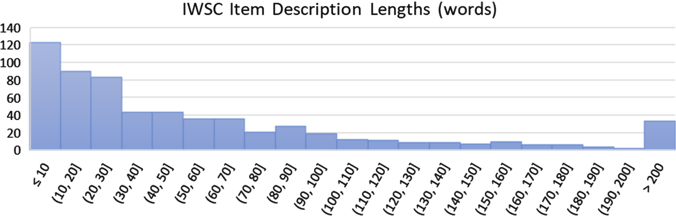 Histogram of item description lengths in the IWSC dataset