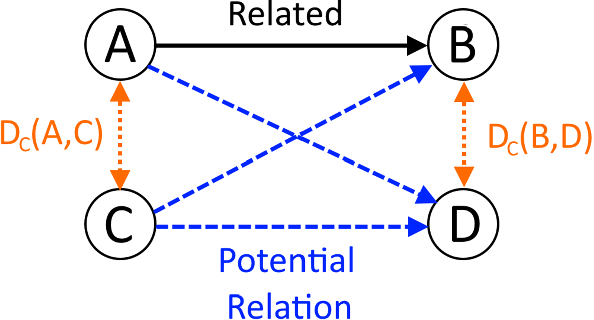 Transitive Semantic Relationships are based on an apparent transitivity property of many types of data items, where it is the case that items which are described similarly are likely to have similar relationships to other data items. Take for example, the supply chain: if company A, a steel mill and company B, a construction firm are known to have the relationship A supplies (sells to) B, it is likely that some other companies C, another steel mill, and D, another construction firm, would have a similar relationship. Given content information about each company, such as a text description of their product or market role, and the example relationship \(A\rightarrow B\), we can infer the potential relationships \(C\rightarrow D\), \(A\rightarrow D\), and \(C\rightarrow B\). We illustrate this example in Fig. 4.