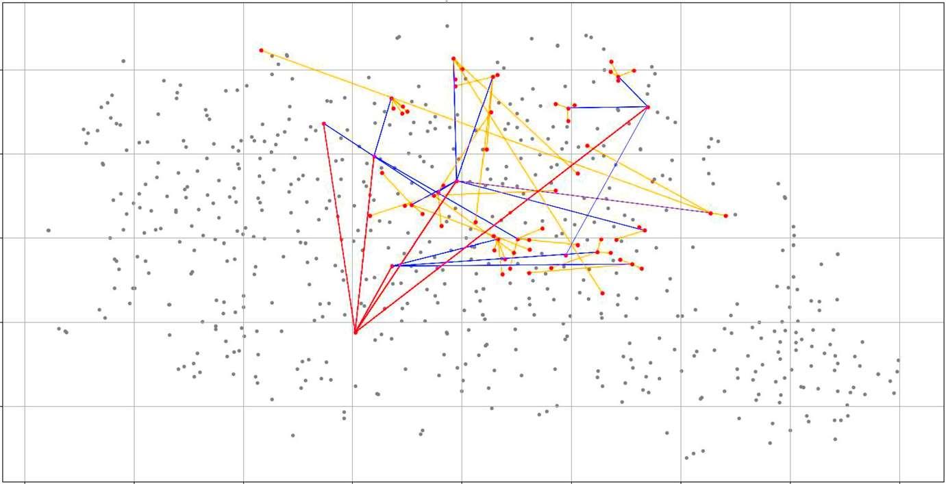 The algorithms TSR-o and TSR-p are the same as TSR-m except that the exponent of the route’s rank, which the score is divided by, is 1 and 2 respectively; these variations perform significantly worse. It is interesting that when penalising the contribution of additional routes, we see sub-standard performance when the penalty is small, but above-standard performance when it is large. This would suggest that some ideal penalty function exists where additional routes do not overpower the score from the best route but still provide support in closely scored cases. It is possible that the best scoring penalty is a property of the distribution of the data and labels, and that the ideal penalty function may be dependent on the dataset. Testing of this property on other datasets, and alternative penalties for this dataset are left to future research.