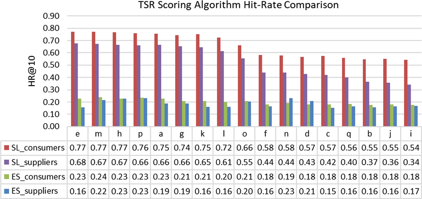 The best performing algorithm for the IWSC-SL tests is TSR-e, where we calculate the target score as the sum of score for the best route and half the score of the second-best route. This produced an improvement to HR@10 of 1.7% for the SL_consumers task and 1.2% for SL_suppliers but has the disadvantage of having a score distribution concentrated towards middle values, as extreme values would require either all routes to be very poor, or both routes to be very good, which is less common than only the best route being very good or bad. This may account for its comparatively high error values as error measurements will be high even for a correct ordering if values are concentrated towards the mid-range.