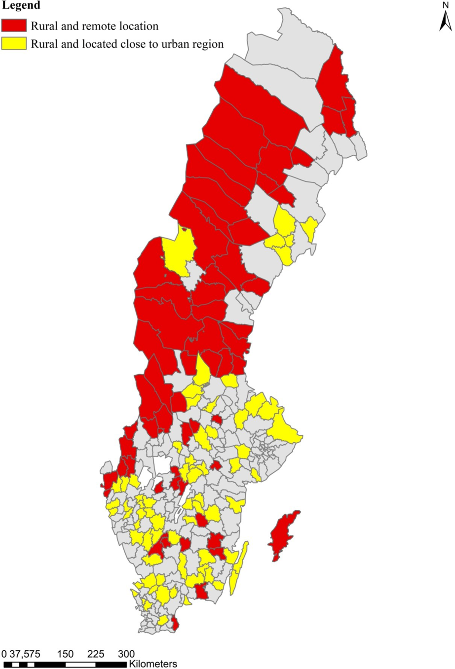 Since the purpose of the survey was to identify possible differences between rural and nonrural municipalities, the compilation of results from municipalities defined by the Swedish Agency for Growth Policy Analysis (2014) as rural (130 municipalities) and nonrural municipalities was used to define rural versus nonrural regions. Since accessibility to urban regions may be important for the recruitment possibilities of rural regions, the distinction between rural municipalities in remote locations and rural municipalities located close to urban regions is also used. Seventy municipalities are defined as rural areas located close to urban regions, and 60 municipalities are defined as rural areas in remote locations.5 For the rural municipalities, representatives from 49 municipalities participated in the survey, corresponding to a response rate of 38%, which is the same as the overall response rate.