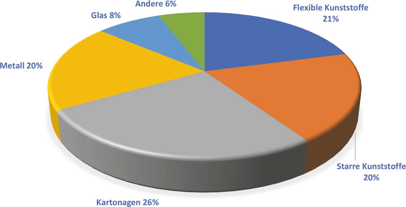 Im Jahr 2010 entfielen 21 % des europäischen Verpackungsverbrauchs auf flexible Verpackungen, was einem Umsatz von 42,9 Mio. US Dollar oder umgerechnet etwa 36,1 Mio. € entspricht, womit flexible Verpackungen die nach Kartonagen umsatzstärkste Verpackungssparte sind. (Pira 2011) (Abb. 1).