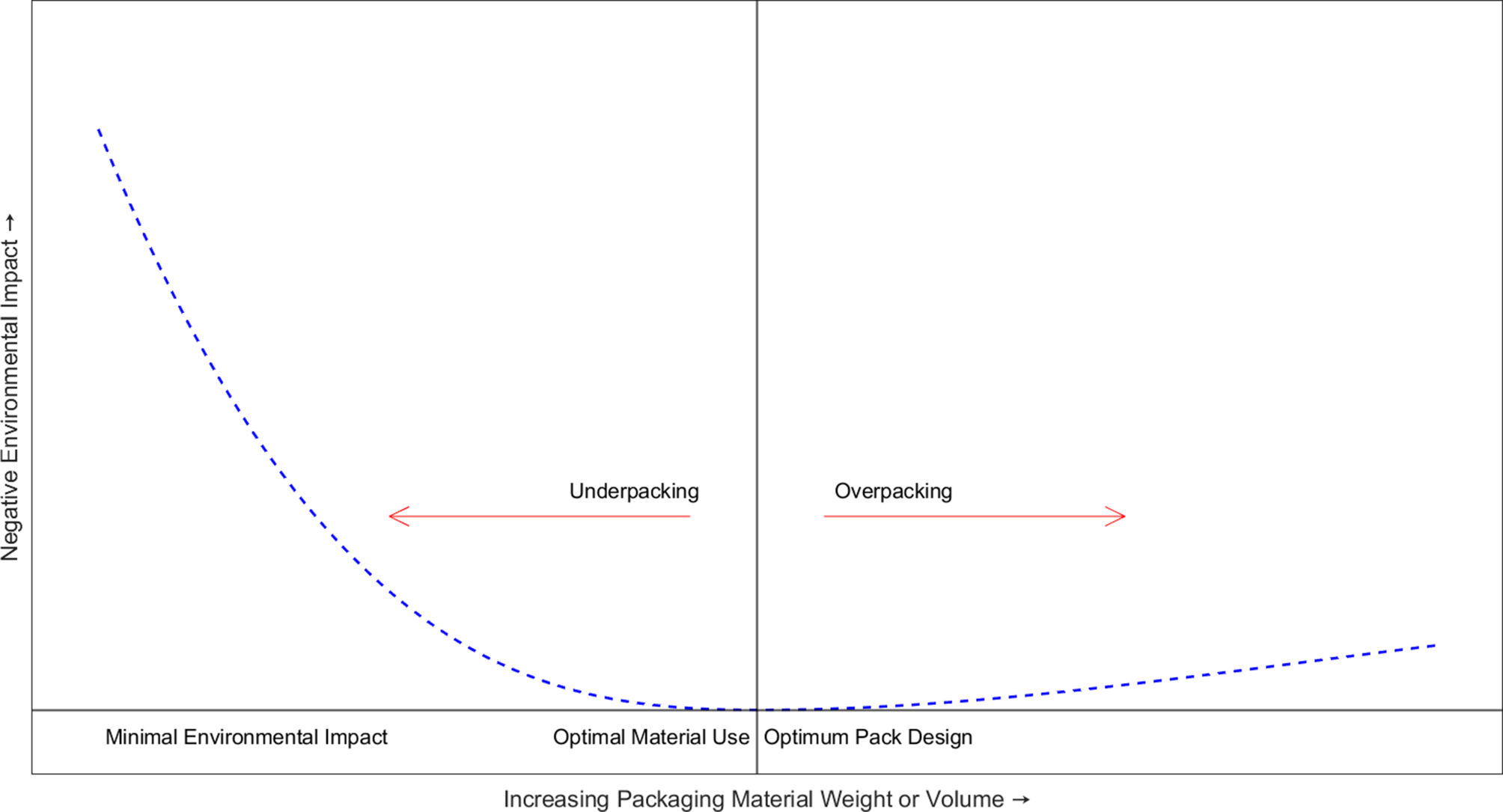 Gemäß dem Innventia AB-Verpackungsmodell (The Consumer Goods Forum 2011), dargestellt in Abb. 2, ist weiters zu beachten, dass die Erzeugung von Lebensmittelabfällen durch zu sparsamen Einsatz von Verpackungsmaterial, sogenanntes Underpackaging, gravierendere ökologische Einflüsse nach sich zieht, als die Haltbarkeit des Produktes durch leichtes Overpackaging zu garantieren.