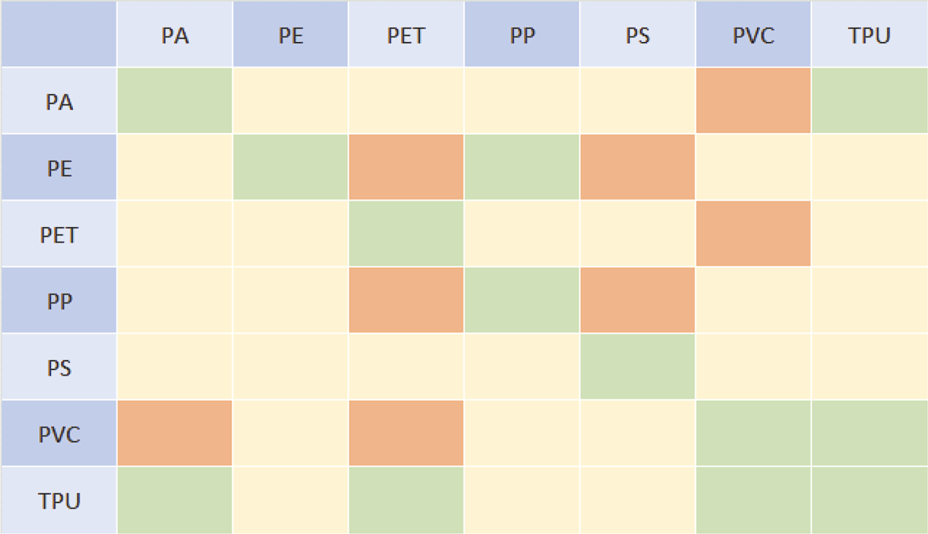 Kompatibilität der gängigsten Kunststoffe. (PA Polyamid, PE Polyethylen, PET Polyethylenterephthalat, PP Polypropylen, PS Polystyrol, PVC Polyvinylchlorid, TPU Thermoplastisches Polyurethan). (Auszug nach Eco3E 2016)