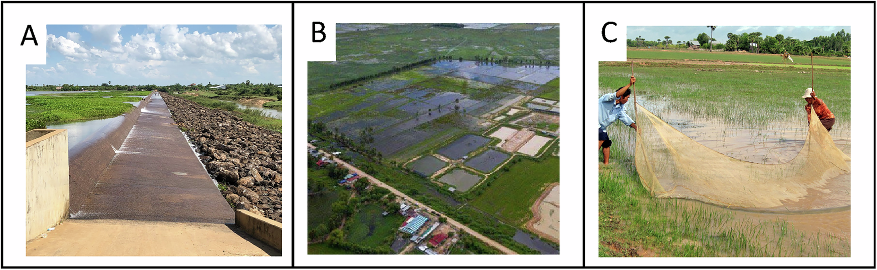 Rivers and floodplains have historically benefited and continue to benefit human societies by providing nutritious aquatic foods, water for agriculture, and hydropower generation among many other services (Arthur et al. 2015; Grill et al. 2019). Dams, weirs, and floodplain infrastructure (Fig. 1) substantially affect river systems and the ecosystem services they provide by changing the timing and magnitude of water flows, and fragmenting aquatic habitats (McCartney et al. 2019). Fragmentation prevents or restricts free movement of aquatic organisms including migratory fish to diverse habitats within the river catchment (Fuller et al. 2015). The combined effect of large irrigation infrastructure is substantial, accounting for 70% of freshwater abstraction (McDermid et al. 2023). Simultaneously, underestimation of the effect of hundreds of thousands of small water infrastructure barriers (<10 m in height) indicates abstraction rates may be much higher than previously realized (Baumgartner et al. 2021). Almost 70% of area under irrigation is in Asia, particularly China and India, but also southeast Asia in the Lower Mekong Basin (LMB) where it mainly supports rice agriculture (McDermid et al. 2023).