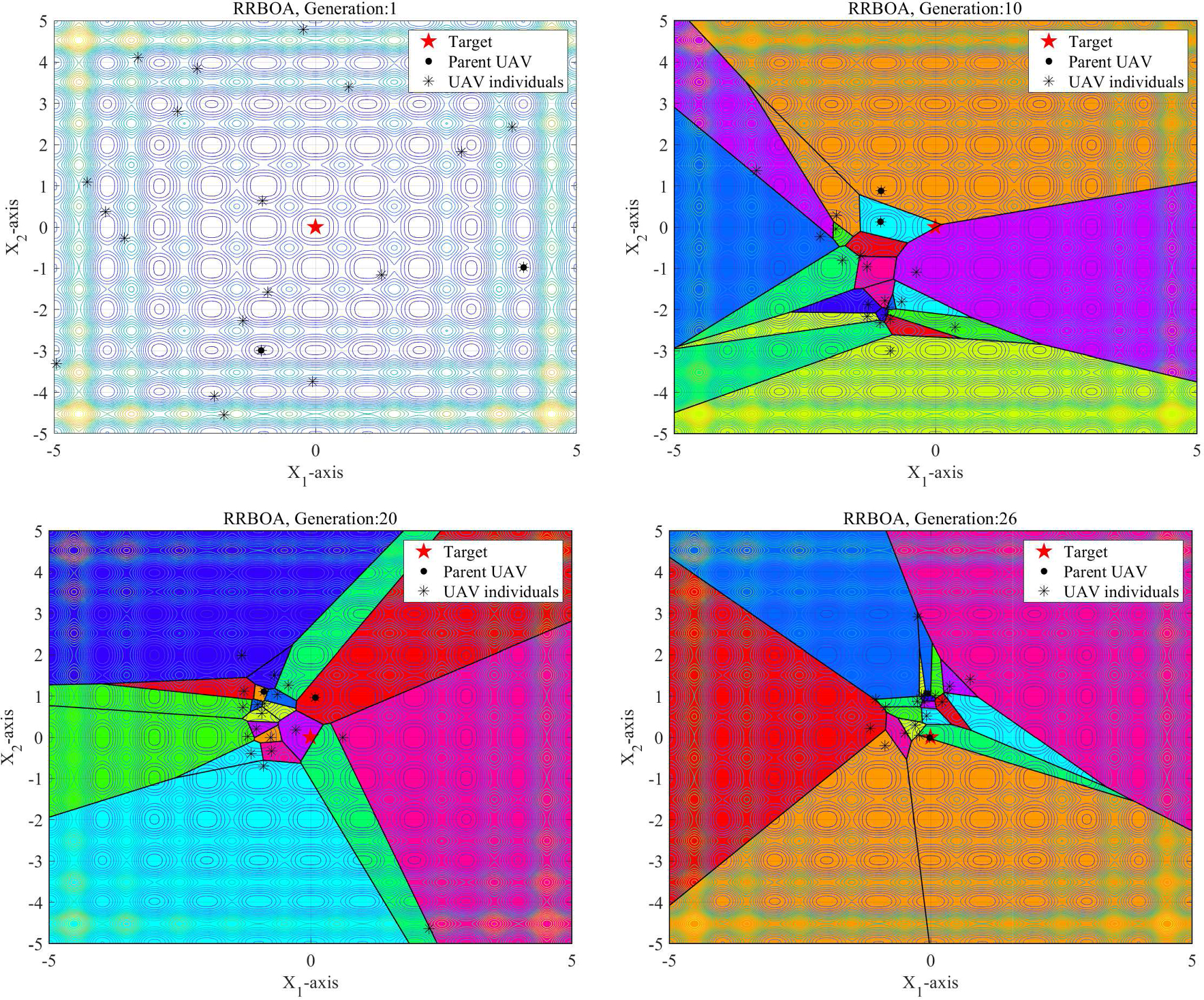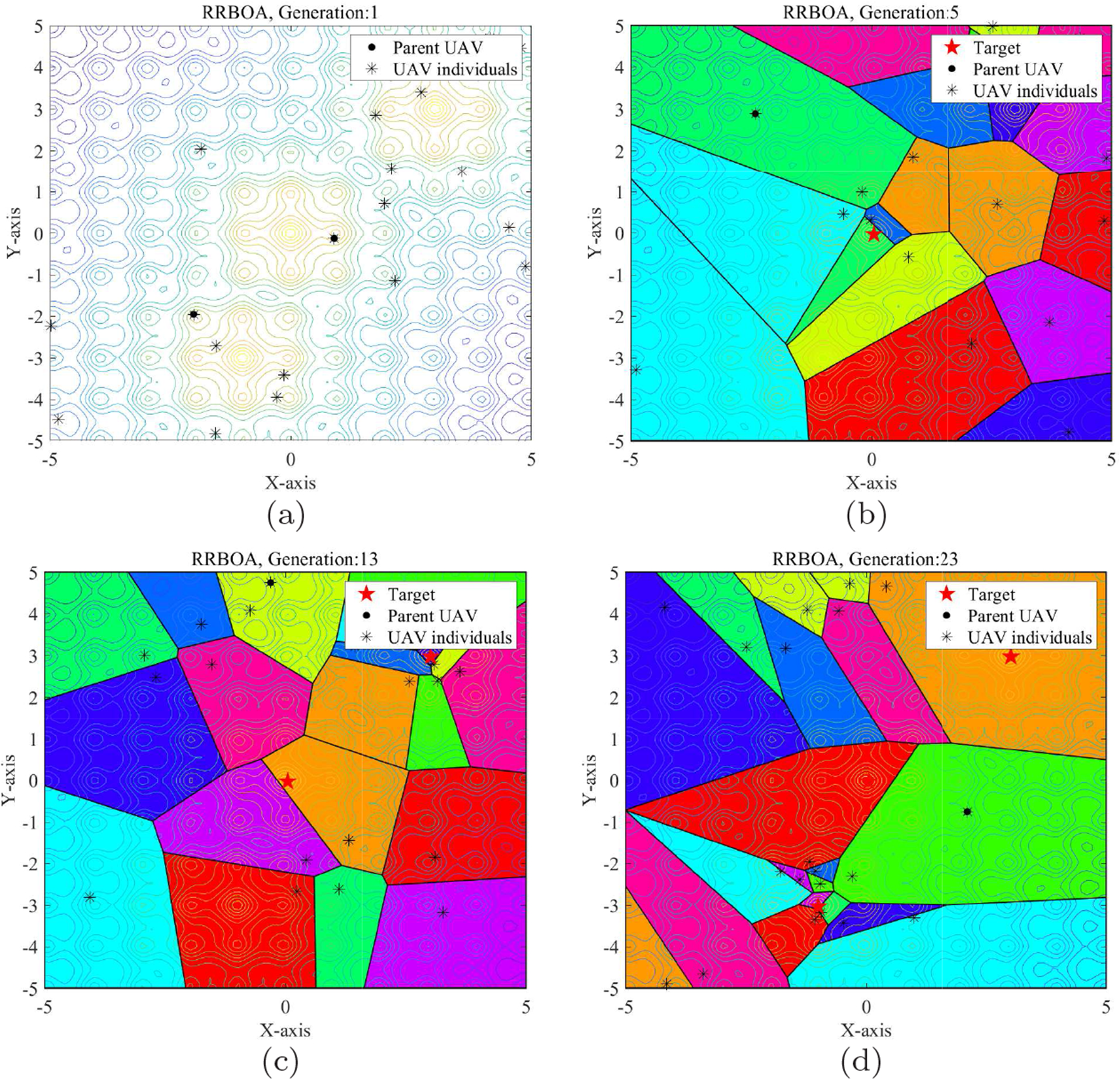 The experimental results of RRBOA in simulating the search for complex pollution sources are presented in Fig. 14. Once a pollution source is found, it is marked with a red pentagram in the graph. As shown in Fig. 14a, the initial assigned positions of the UAV individuals are depicted based on the region segmentation exploration strategy. Figure 14b demonstrates that the UAVs finds the first pollution source location in the 5th generation, positioned at \(\left( 0,0\right) \). In Fig. 14c, the UAVs finds the second pollution source in the 13th generation, positioned at \(\left( 3,3\right) \). Figure 14d displays that the UAVs discovers the third pollution source in the 23th generation, positioned at \(\left( -1,-3\right) \). For RRBOA, the UAVs can efficiently re-allocate themselves to parent UAV individuals without located pollution source after finding a pollution source, thereby enhancing global exploration capability of the algorithm. As shown in Fig. 15, it illustrates a comparison between RRBOA and A-RPSO for the average iteration times of target found in 100 experiments, with a UAVs size of 20. It can be observed that RRBOA is able to find all targets within approximately 23 iterations, while A-RPSO needs a larger number of iterations to recognize all target regions. RRBOA has a higher search efficiency than A-RPSO due to the presence of multiple targets can increase the probability of trapping in local optima.