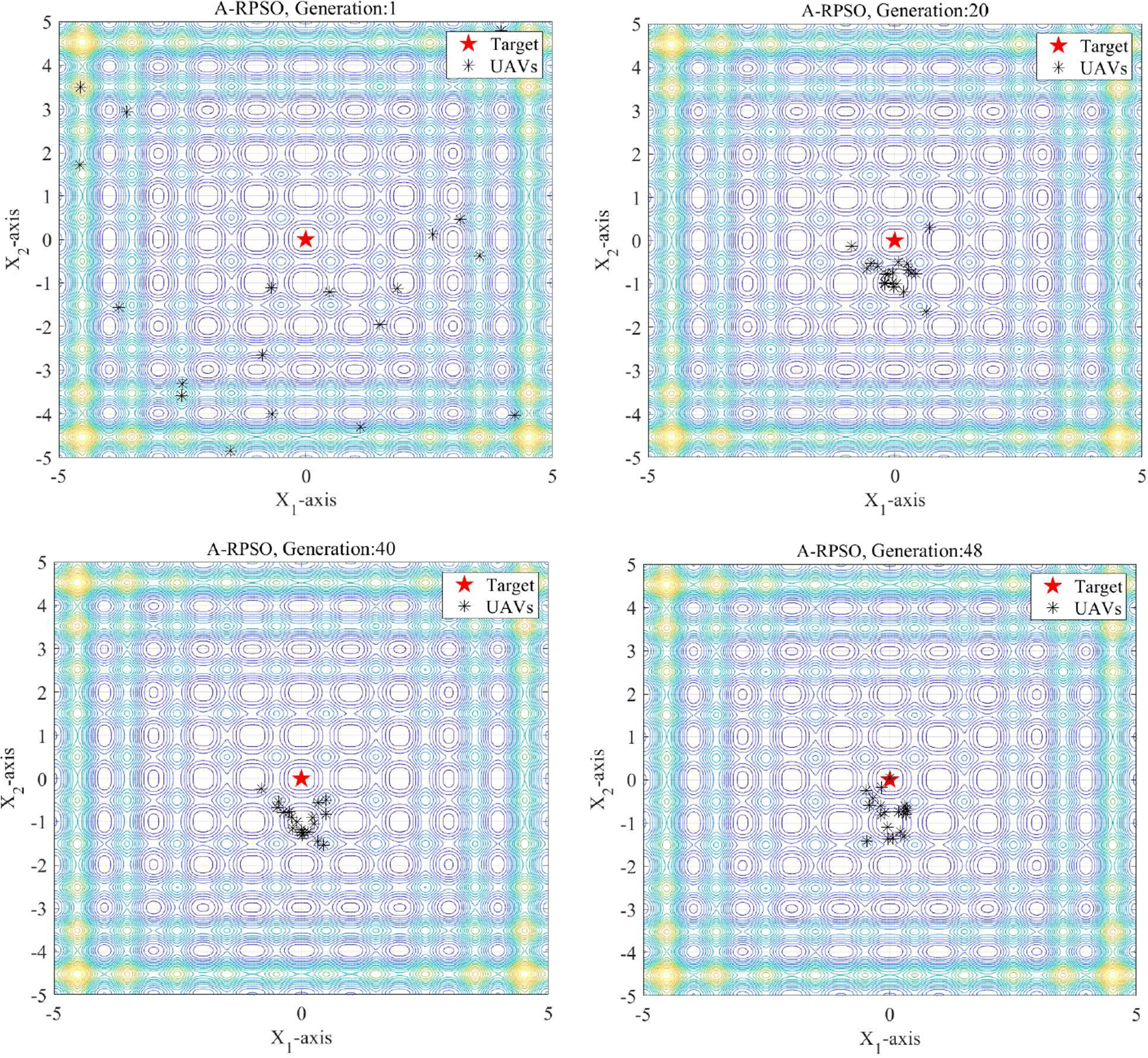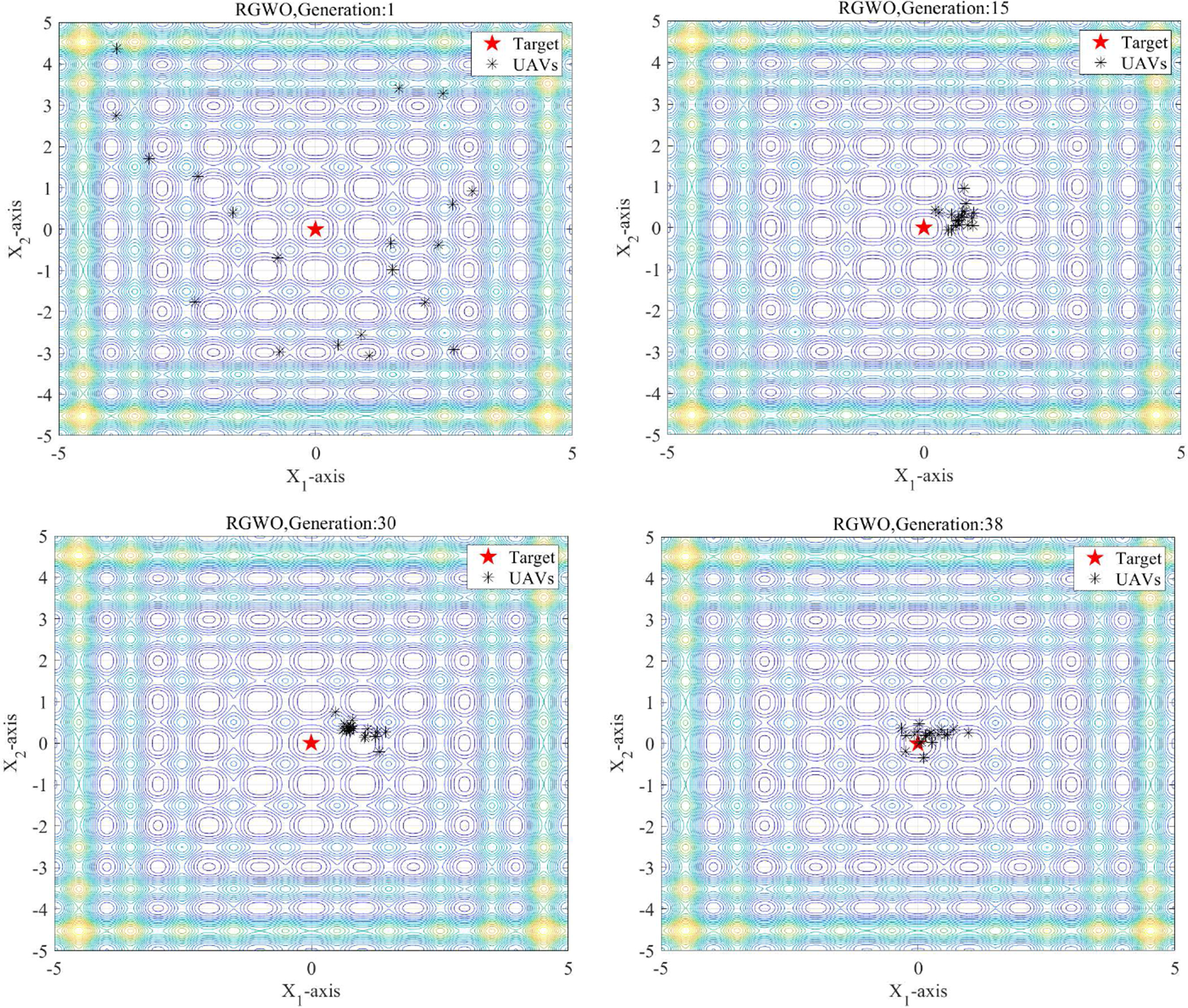 Figures 10, 11, 12, 13 show the positions of UAVs for RRBOA, A-RPSO, RGWO, and ISSA with different generations on benchmark function F7, respectively. The position of the red pentagram in the center represents the target area of UAVs search. The first figures in Figs. 10, 11, 12, 13 respectively are the initial distribution of UAVs for RRBOA, A-RPSO, and RGWO, which show that RRBOA has a more uniform distribution of UAVs compared to A-RPSO and RGWO. This highlights the advantage of the proposed region segmentation strategy in this study. As iteration progresses, A-RPSO and RGWO exhibit a distinct aggregation pattern of UAVs, which not only leads to a local optimum but also poses a risk of UAVs collision. Although ISSA does not exhibit a aggregation pattern of UAVs, it is difficult to quickly locate the target. RRBOA finds the target location when the number of iterations reaches 26, while A-RPSO, RGWO and ISSA respectively find the target location after 48, 38 and 45 iterations because they may fall into local optimum. For RRBOA, UAV individuals move within their respective independent region, effectively avoiding collisions with others. Moreover, the neutral evolution strategy and the Levy flight strategy further contribute to preventing UAVs from getting stuck in local optima. The experimental results demonstrate the effectiveness of RRBOA in cooperative target search problems.