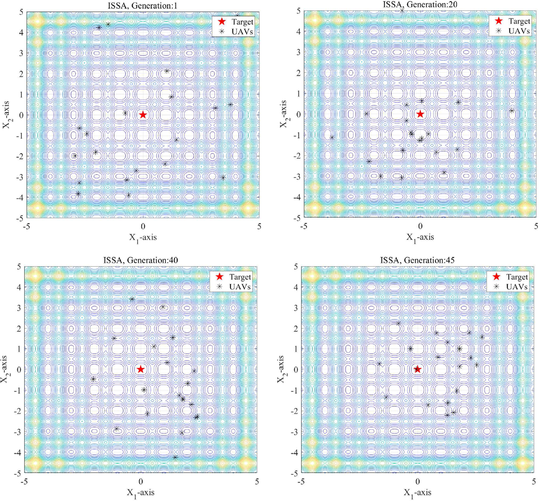 Recently, some swarm intelligent optimization algorithms are developed for target search of UAVs. Niu et al. propose an improved sand cat swarm optimization algorithm by combining the motion-encoded mechanism, the elite pooling strategy and the adaptive T-distribution to increase planning efficiency and avoid local optima, thus enhancing the effectiveness for locating moving targets with UAVs [42]. However, it fails to address issues like UAVs collisions. Fei et al. proposed an improved sparrow search algorithm for target search, called ISSA [20]. In ISSA, a new cooperative framework is designed to control the observation locations of UAVs, and the position update strategy to local communication is utilized to adjust the UAVs’ position in the search space. Nevertheless, ISSA exists the issues that are UAVs collisions and potential local optima.