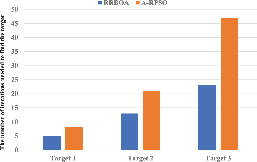 Average iteration times of target found in 100 experiments for RRBOA and A-RPSO when the size of UAVs is 20