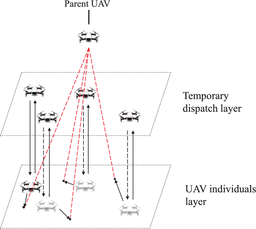 Spatial hierarchy structure of UAVs in the scheduling process. The structure consists of parent UAV individuals layer, temporary dispatch layer and UAV individuals layer, where the parent UAV is selected from the relatively optimal individuals based on the overall condition of the UAVs