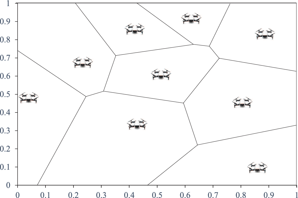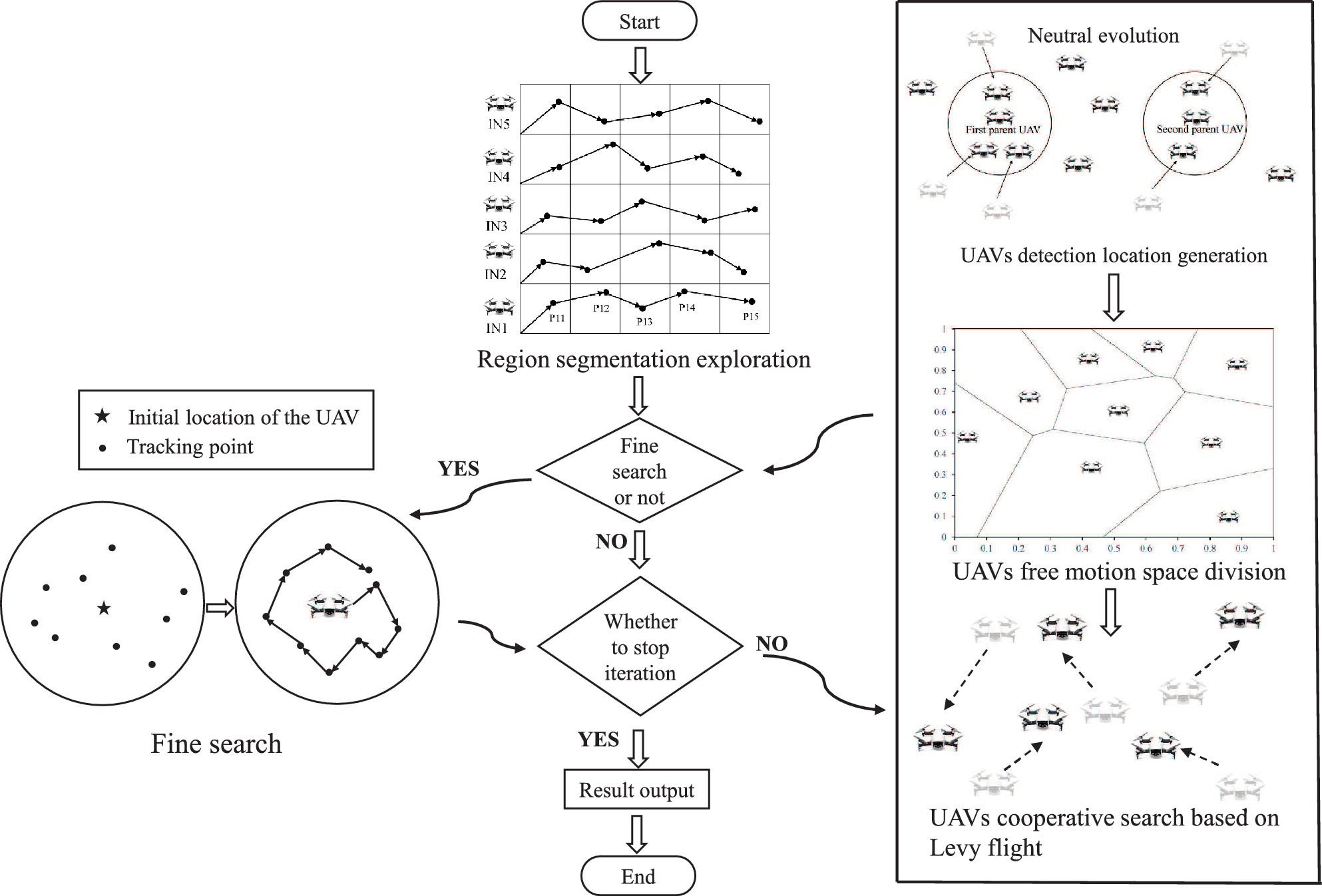 After determining the new location of the UAVs, it is divided into free motion based on voronoi diagram, and then the UAV cluster performs wide-area cooperative search based on Levy flight.