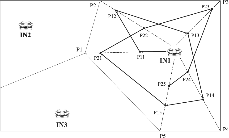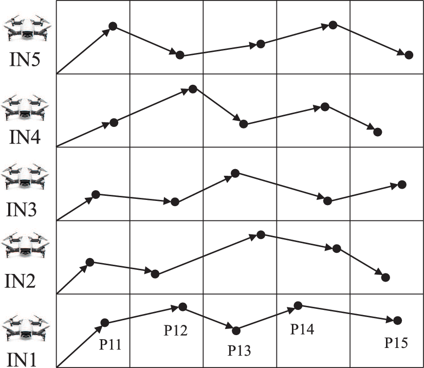 Taking IN1 as an example, its motion track points are \(P_{11}\), \(P_{12}\), \(P_{13}\), \(P_{14}\), and \(P_{15}\). The trajectory of UAV is as follows: