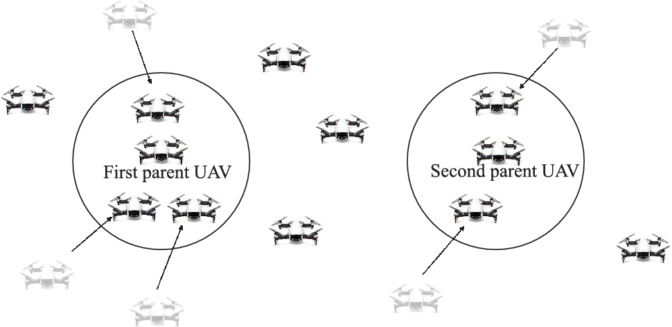 After cooperative search of UAVs, the detected information will be integrated, and the system will evaluate the first several location points with better fitness values. The number of location points depend on the number of parent UAV individuals. The UAV with the best fitness value is selected the 1th parent UAV, all parent UAV individuals are numbered and sorted according to their fitness values.