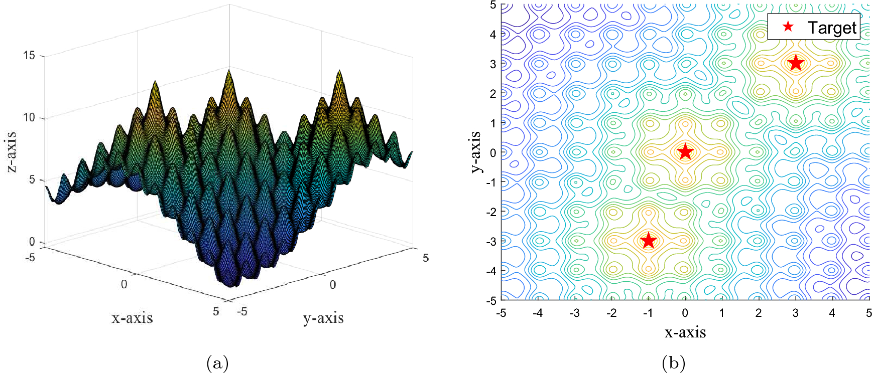 Subsequently, this paper established a new pollution source search scenario based on atmospheric pollution source dispersion models such as the Gaussian plume model, Sutton model, FEM3 model, and CALPUFF model, validating the practicality of RRBOA. The pollution source dispersion model is defined by the benchmark functions with multiple extremes, which is shown in Eq. (21):
