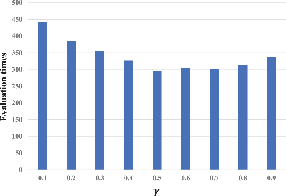 Considering RRBOA is sensitive to the total proportion of sub-UAVs allocated by the parent UAV, a series of experiments are carried out to determine the optimal value of \(\gamma \). This paper conducts 100 independent experiments on nine benchmark functions for various value of \(\gamma \) in [0.1, 0.9], where the size of UAVs is set to 20, and the average evaluation times of target found are calculated to evaluate the performance of the algorithm. Figure 8 shows the average evaluation times of target found for RRBOA with different \(\gamma \). The experimental results indicate that the average evaluation times required for RRBOA to find the target gradually decreases along with increase of \(\gamma \) ranging from 0.1 to 0.5. Moreover, as the value of \(\gamma \) increases from 0.5 to 0.9, the average evaluation times for RRBOA to find the target also increase. The experimental results illustrate the effectiveness of the neutral evolution strategy adopted in this paper. When the value of \(\gamma \) equals 0.5, half of the UAVs are allowed to use the neutral evolution strategy for position updates, thus leading to the best performance of RRBOA in cooperative target search.