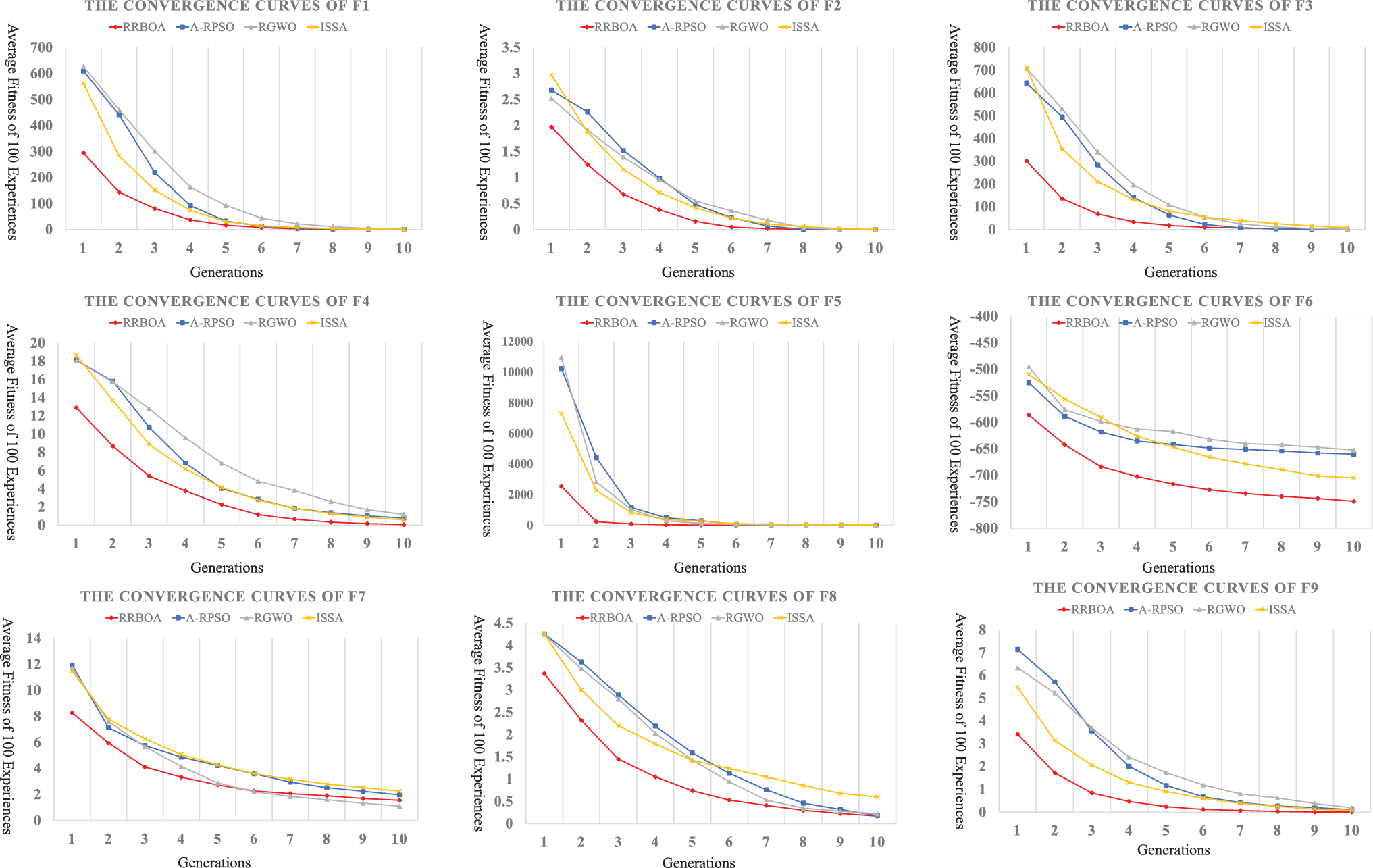 Convergence curves of RRBOA, A-RPSO, RGWO, and ISSA on nine benchmark functions