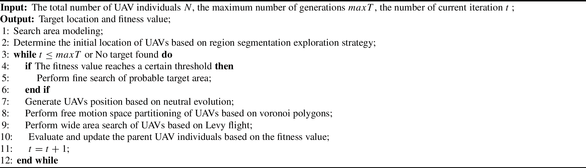 The technology of unmanned aerial vehicle swarm (UAVs) covers design, construction, and deployment of UAVs, and UAVs system has capability to collaborate in problem-solving and task execution through coordinated manner [1, 2]. UAVs system is primarily applied in areas such as exploration, patrolling, and surveillance in the contexts of earthquakes, wildfires, natural resources and environmental monitoring [3, 4]. Nowadays, the research on UAVs systems involves various aspects, such as target search [5, 6], path planning [7, 8], and task assignment between UAVs [9, 10]. The application of intelligence optimization algorithms to the target search is a significant research direction. UAVs system can obtain a better performance than individual UAV system when the optimization algorithm facilitates the effective cooperative between UAVs [11]. Notably, if optimization algorithm assists the UAVs system in possessing powerful cooperative capability, it will make the execution of complex target search tasks more efficient and reliable.