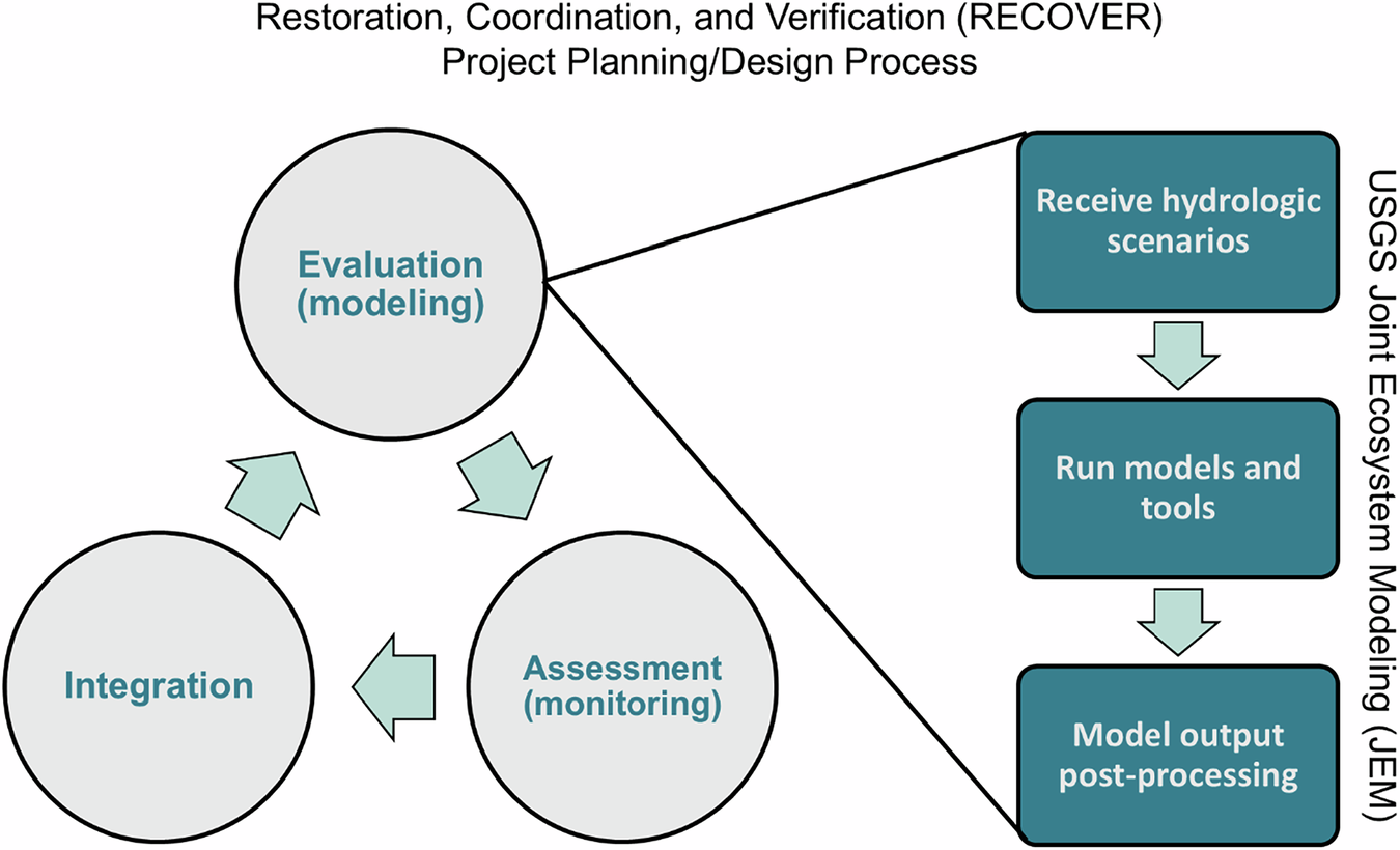 REstoration, COordination, and VERification (RECOVER), an interagency and interdisciplinary science team, is responsible for the coordination of CERP and its adaptive management program (RECOVER 2015, Fig. 1). At regular intervals, RECOVER provides a synthesis on the system-wide progress of CERP using information from this project evaluation and assessment cycle. The United States Geological Survey (USGS) Joint Ecosystem Modeling (JEM) team has co-developed a suite of models and DSTs with RECOVER since 2010 to assist in the evaluation of restoration plans. JEM works closely with RECOVER to provide ecological model output based on hydrologic scenarios, including visualizations and post-processed data to provide RECOVER with the information they need to complete their communication and integration tasks. Although RECOVER and independent scientists have long recognized that potential climate change impacts, such as SLR, should be formally incorporated into the evaluation phase (NASEM 2008; RECOVER 2014, RECOVER 2019; NASEM 2024), only the Biscayne Bay and Southeastern Everglades (BBSEER) project has attempted this thus far (USACE and SFWMD 2023).