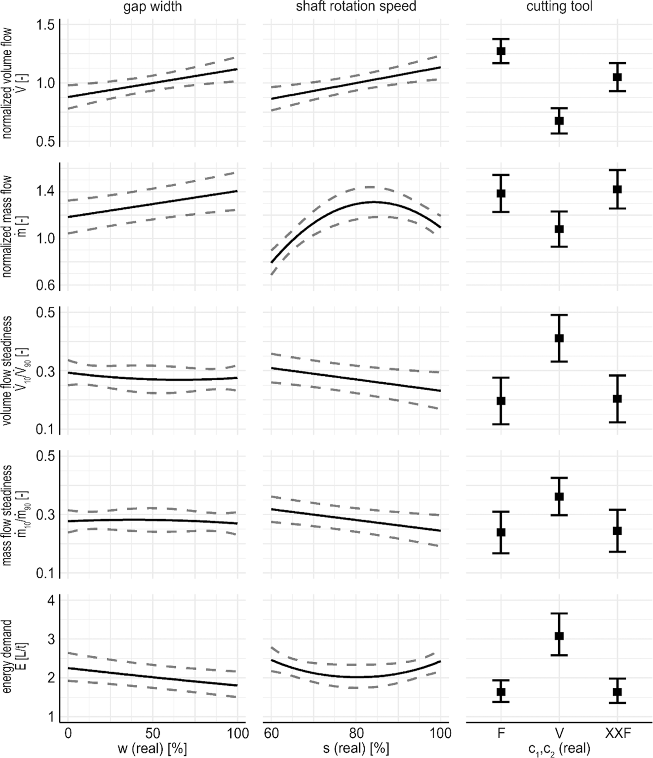 Effektdiagramme mit Konfidenzbereichen für den Einfluss von Spaltweite, Wellendrehzahl und Schneidwerkzeuggeometrie auf Durchsatz, Durchsatzstabilität und spezifischen Energiebedarf bei mittleren Einstellungen der jeweils anderen Faktoren (Khodier et al. 2020)