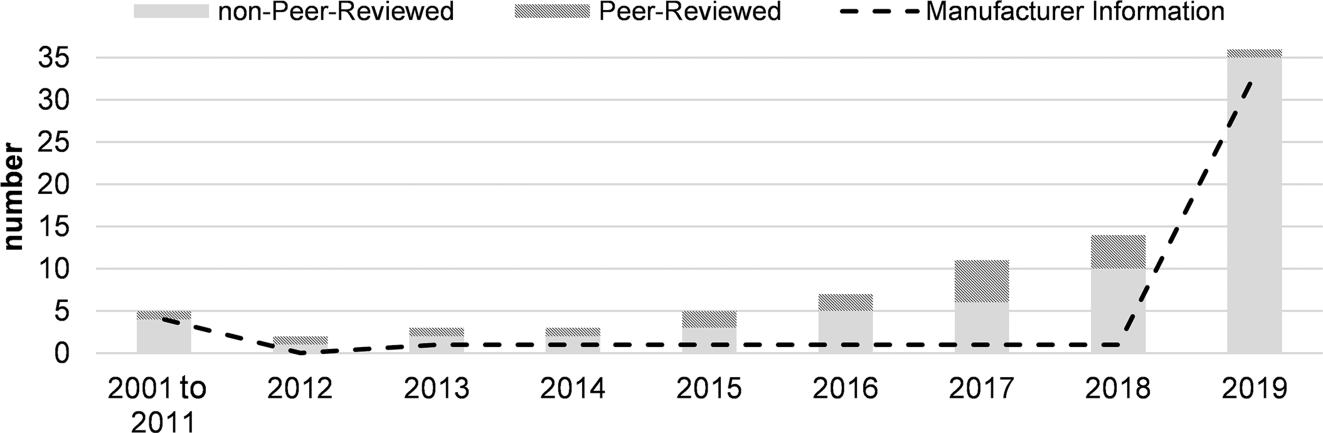 Anzahl der rezensierten Literaturquellen nach Art, zugeordnet zu peer-reviewten oder nicht peer-reviewten Arbeiten in den Jahren 2001 bis 2019 (Sarc et al. 2019b)