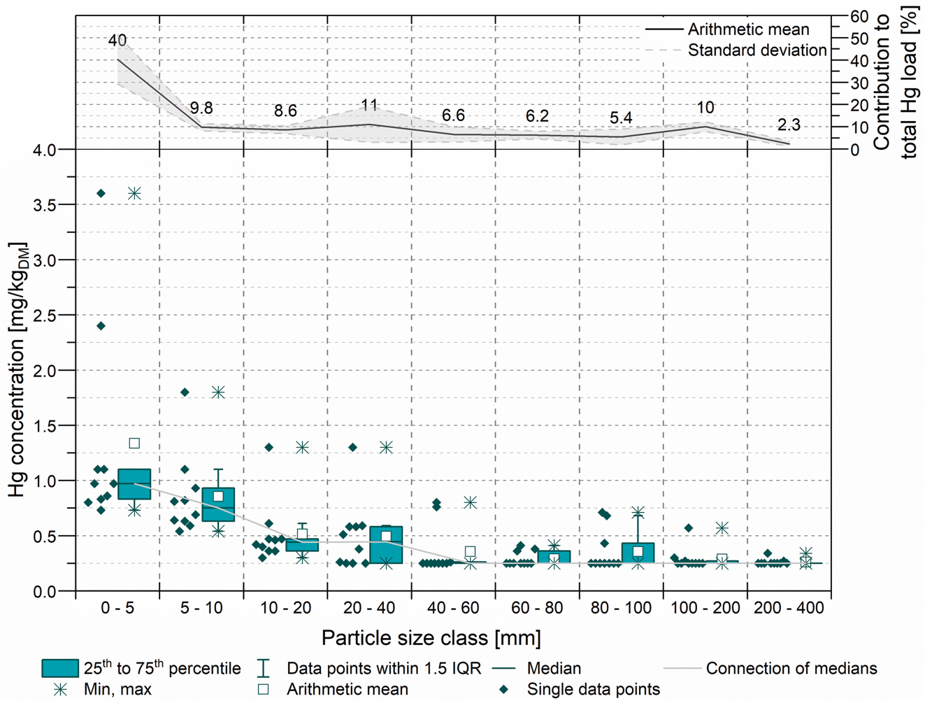 Hg-Konzentrationen in verschiedenen Korngrößenklassen von gemischten Gewerbeabfällen und Beitrag jeder Korngrößenfraktion zur gesamten Hg-Belastung (Viczek et al. 2021b)