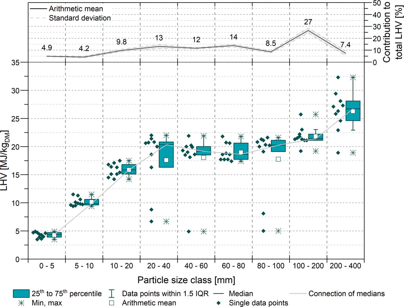 Unterer Heizwert verschiedener Korngrößenklassen von gemischtem Gewerbeabfall und Beitrag jeder Korngrößenfraktion zum gesamten Heizwert (Viczek et al. 2021b)