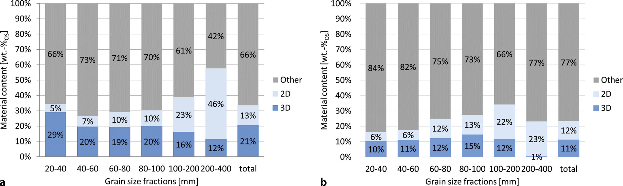 Die in Abb. 5 dargestellten Ergebnisse zeigen, dass gemischte Gewerbeabfälle einen doppelt so hohen Kunststoff-3D-Gehalt aufweisen wie gemischte Siedlungsabfälle. Der Kunststoff-2D-Gehalt (z. B. Folien) ist dagegen in beiden gemischten Abfallarten ähnlich. Für beide Abfälle ist auch eine Abhängigkeit der Dimensionalität der Kunststoffpartikel von der Korngröße zu erkennen: Der Anteil der 3D-Partikel ist in kleinen Korngrößenklassen höher, während in großen Größenklassen mehr 2D-Kunststoffe zu finden sind. Diese Information ist relevant, um den Abfallstrom gezielt und effizient zu behandeln und die gewünschte Fraktion im richtigen Prozessschritt abtrennen zu können. Auch für die Weiterverarbeitung ist die Partikelform von großer Bedeutung für den Trenn- und Sortiererfolg und die damit verbundene Reinheit der Zielfraktion (z. B. Flugverhalten von Folien in der NIR-Sortierung) (Möllnitz et al. 2020a).