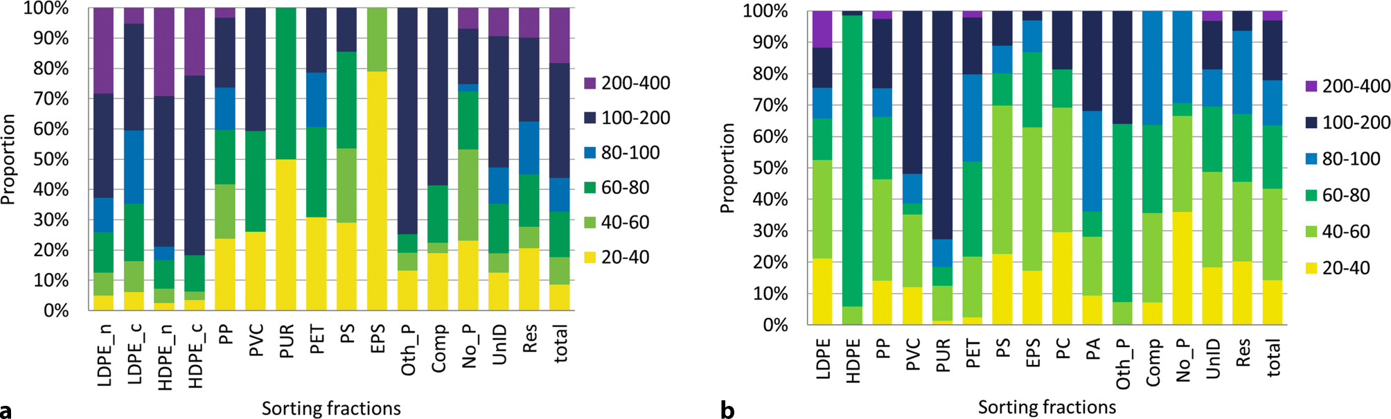 Korngrößengrößenverteilung in den untersuchten Materialtypen für Kunststoffe-2D (a) und Kunststoffe-3D (b) normiert auf 100 % für gemischten Gewerbeabfall (Möllnitz et al. 2020a)