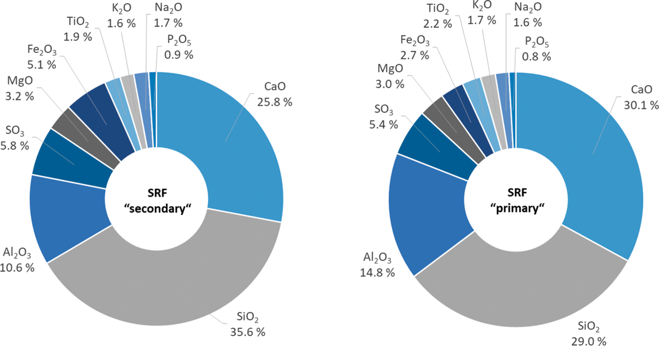 Um den stofflich verwertbaren Anteil (R-Index) von EBS zu bestimmen, haben Aldrian et al. (2020) eine analytische Methode zur Bestimmung der Aschezusammensetzung entwickelt und validiert und eine Formel zur Berechnung dieses R‑Index vorgeschlagen. Die durchschnittliche Aschezusammensetzung (arithmetisches Mittel) von primären- und sekundären EBS ist in Abb. 7 dargestellt. Unterschiedliche R‑Indizes werden erreicht, wenn verschiedene Elementoxide berücksichtigt werden (Viczek et al. 2020b): Werden z. B. nur Al2O3, CaO, SiO2 und Fe2O3 berücksichtigt, werden R‑Indizes von 13,9 % (EBS sekundär) bzw. 13,3 % (EBS primär) erreicht. Wenn zusätzlich MgO, TiO2, K2O, Na2O und SO3 berücksichtigt werden, steigen die R‑Indizes auf 16,2 % für EBS sekundär oder 15,9 % für EBS primär. Wird der gesamte Ascheanteil als recycelt betrachtet, beträgt der R‑Index 17,7 % (EBS sekundär) und 17,6 % (EBS primär).
